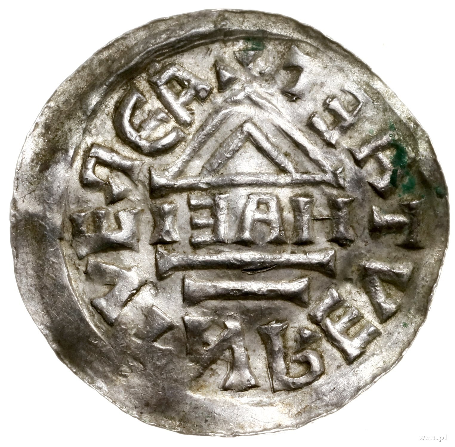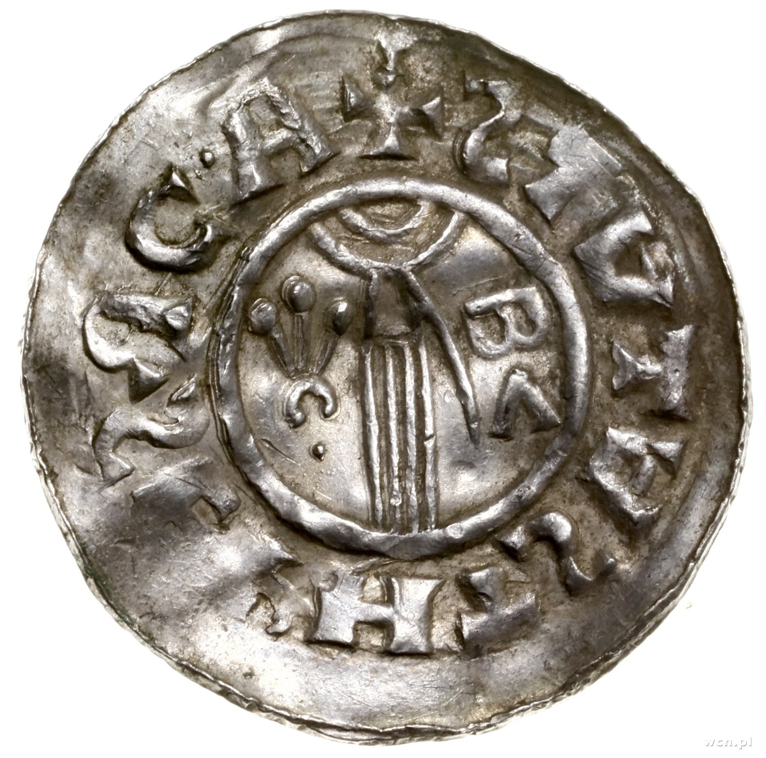 Bolesław Chrobry (1003–1004), Denar typu bawarskiego, mennica Praga (?); Aw: Dłoń opatrzności, po bokach BΛ oraz ozdobnik, + STATASTHPESRCA; Rw: Kaplica ze spiczastym dachem zwieńczonym krzyżem, wewnątrz HAEI (wstecznie), TEATVERNTVEREA; srebro, 21.5 mm, 1.30 g; Cach 226, Frynas B.5.3 (R), Šmerda 94 (R3); lekko gięty, bardzo rzadki. Jan Šmerda przypisuje ten typ denara polskiemu księciu Bolesławowi Chrobremu na okres jego pobytu w Czechach, jednak najnowsze badania przesuwają datowanie na nieco wcześniejsze, tzn. czas panowania Bolesława III, co jednak nie wpływa na rzadkość tego typu monety.