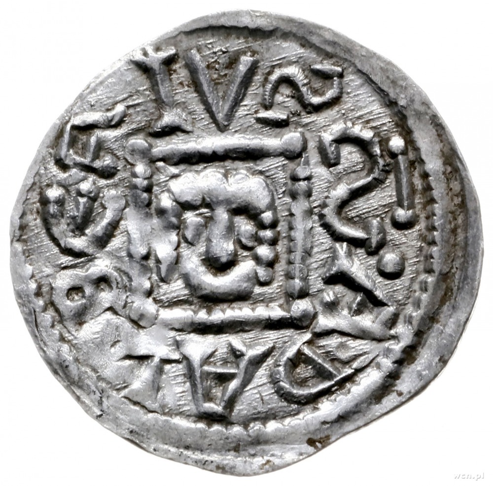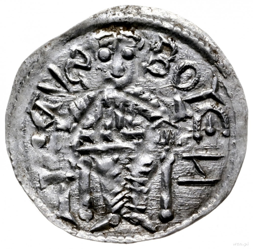 denar z lat 1146-1157; Aw: Książę z mieczem trzymanym p...