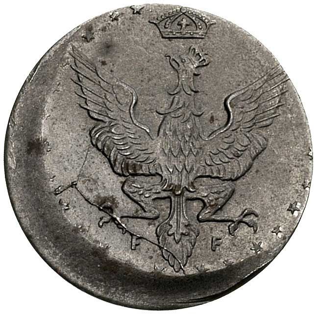 Monety niemieckich władz okupacyjnych dla Królestwa Polskiego, destrukt monety 20 fenigów 1918 / F, Stuttgart, Parchimowicz 7 b, bardzo ładny egzemplarz, niecentrycznie wybity