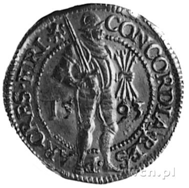 HOLANDIA, dukat 1593, Fryzja, Aw: Postać rycerza, w tle data, w otoku napis, Rw: Napis w pięciu liniach, wpisany w ozdobnykwadrat, Delm. 1013, rzadki, ładnie wybity