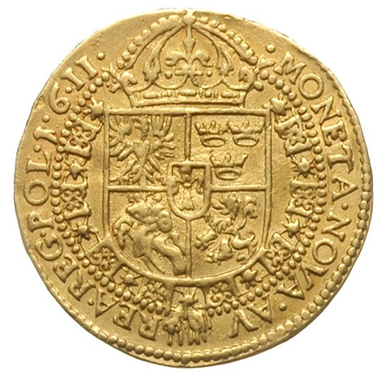 Zygmunt III Waza 1587-1632, dukat 1611, Kraków, Aw: Popiersie króla i wokoło napis SIGIS III DG - REX POL ET SVE, Rw: Czteropolowa tarcza herbowa i napis wokoło MONETA NOVA AV - REA REG POL 1 6 11, H-Cz. -, Kaleniecki s. 80, T. -, złoto 3.45 g, dukat ogromnej rzadkości znana tylko ze zbiorów Potockiego, Sobańskiego i Czerwińskiego. Moneta z 10 aukcji WCN, minimalnie gięty, ładnie zachowany egzemplarz z patyną