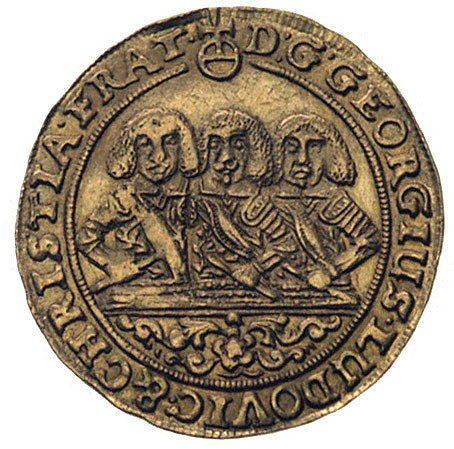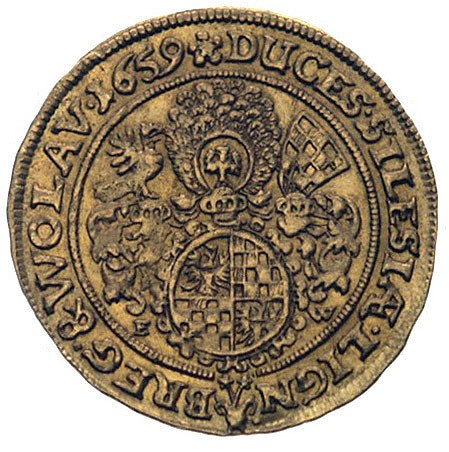 Jerzy III Brzeski, Ludwik IV Legnicki, Krystian Wołowsko-Oławski 1639-1663, dukat 1659, Brzeg, F.u.S. 1776, Fr. 3200, złoto, 3.48 g, patyna