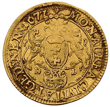dukat 1677, Gdańsk, H-Cz. 2437 (R2), Fr. 36, złoto, 3.4...