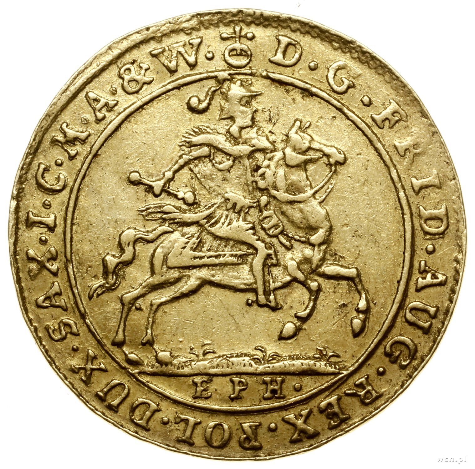 monety sasko-polskie, Dukat, 1712 EPH, Lipsk; Aw: Król na koniu w prawo, poniżej litery EPH (Ernst Peter Hecht), w otoku napis; Rw: Pod koroną pięciopolowa tarcza herbowa na tle sztandarów i wstęg, wokoło napis; Fr. 2806, Kahnt 65, Schön 19; złoto 3.45 g; rzadszy rocznik, bardzo ładnie zachowany. August II wstępując na polski tron podpisał w czasie sejmu koronacyjnego tak zwane „Pacta Conventa”. Znajdowały się w nich osobiste zobowiązania króla - między innymi zakazywały one bicia monety bez zgody Sejmu i Senatu. Trzeba napomnieć, że władca chciał bicia monety polskiej w mennicach koronnych, jednak Sejm mocno mu to utrudniał. August II dopiął jednak swego, a rozbita i skłócona magnateria polska była zbyt bezsilna by wyciągnąć konsekwencje wobec działań menniczych władcy. W 1698 roku mincmistrz Ernest Piotr Hecht (działał w latach 1693 - 1714) rozpoczął bicie polskich monet koronnych w mennicy w Lipsku na polecenie Augusta II.