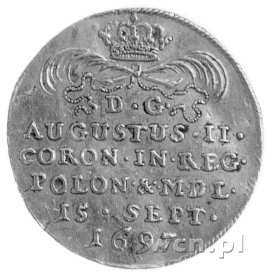 August II 1697-1733, dukat koronacyjny 1697, na awersie ręka z szablą, Merseb. 1400, Fr. 2830, złoto, waga 3,45g.