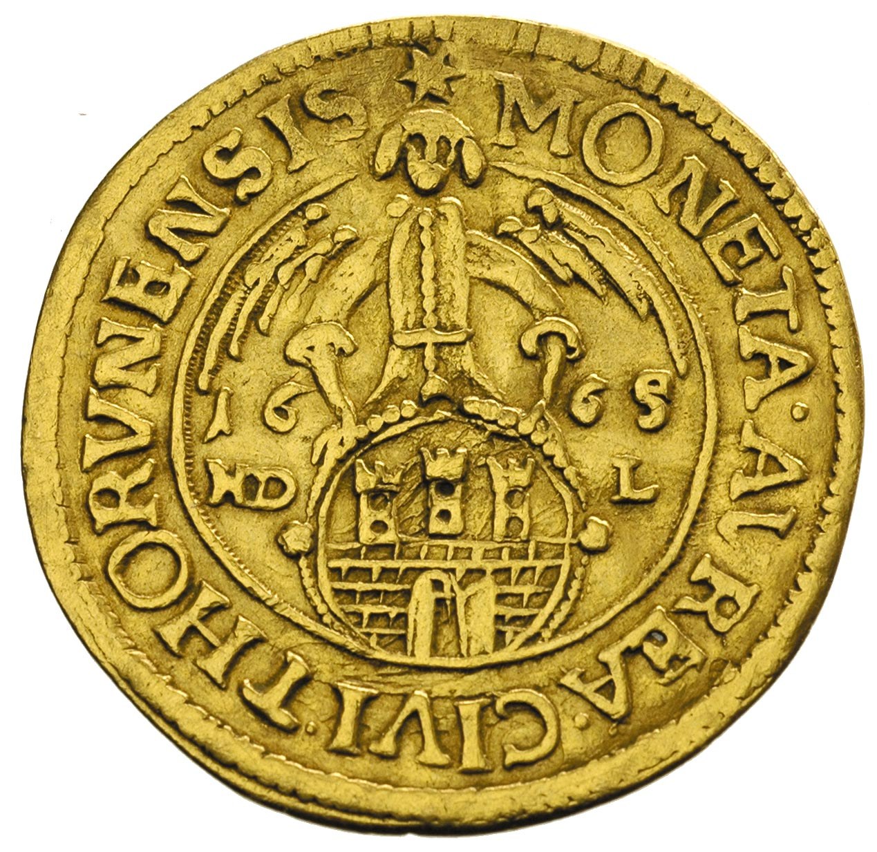 Jan II Kazimierz 1649-1668, dwudukat 1665, Toruń, Aw: Popiersie króla w prawo i napis wokoło IOAN CAS D G R POL & SVE M D L R P, Rw: Herb Torunia, po bokach data i litery HD - L, napis wokoło MONETA AVREA CIVIT THORVNENSIS, złoto 6.69 g, H-Cz. 2291 R4, Kaleniecki s. 447, T. 70, rzadki