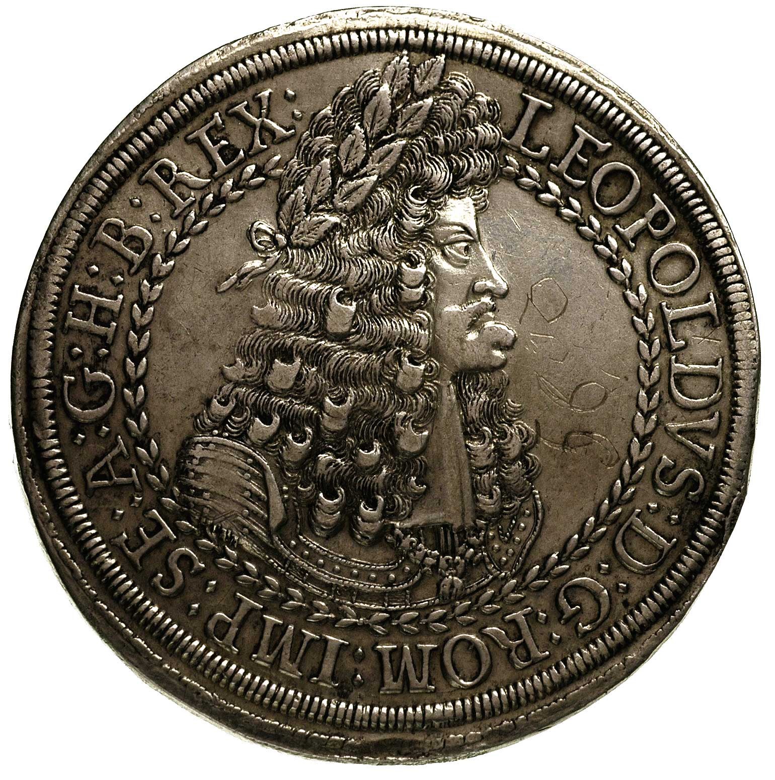 Leopold I 1657-1705, dwutalar, bez daty, Hall, Aw: Popiersie i napis wokoło, Rw: Orzeł i napis wokoło, 56.64 g, Dav. 3252, Herinek 574, na awersie graffiti w tle ale mimo to efektowna moneta