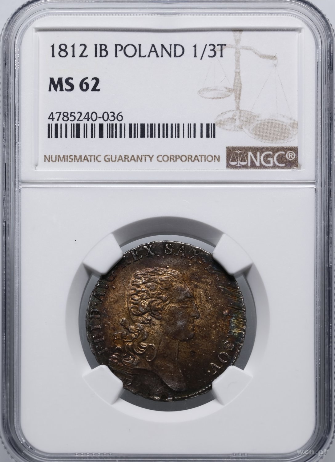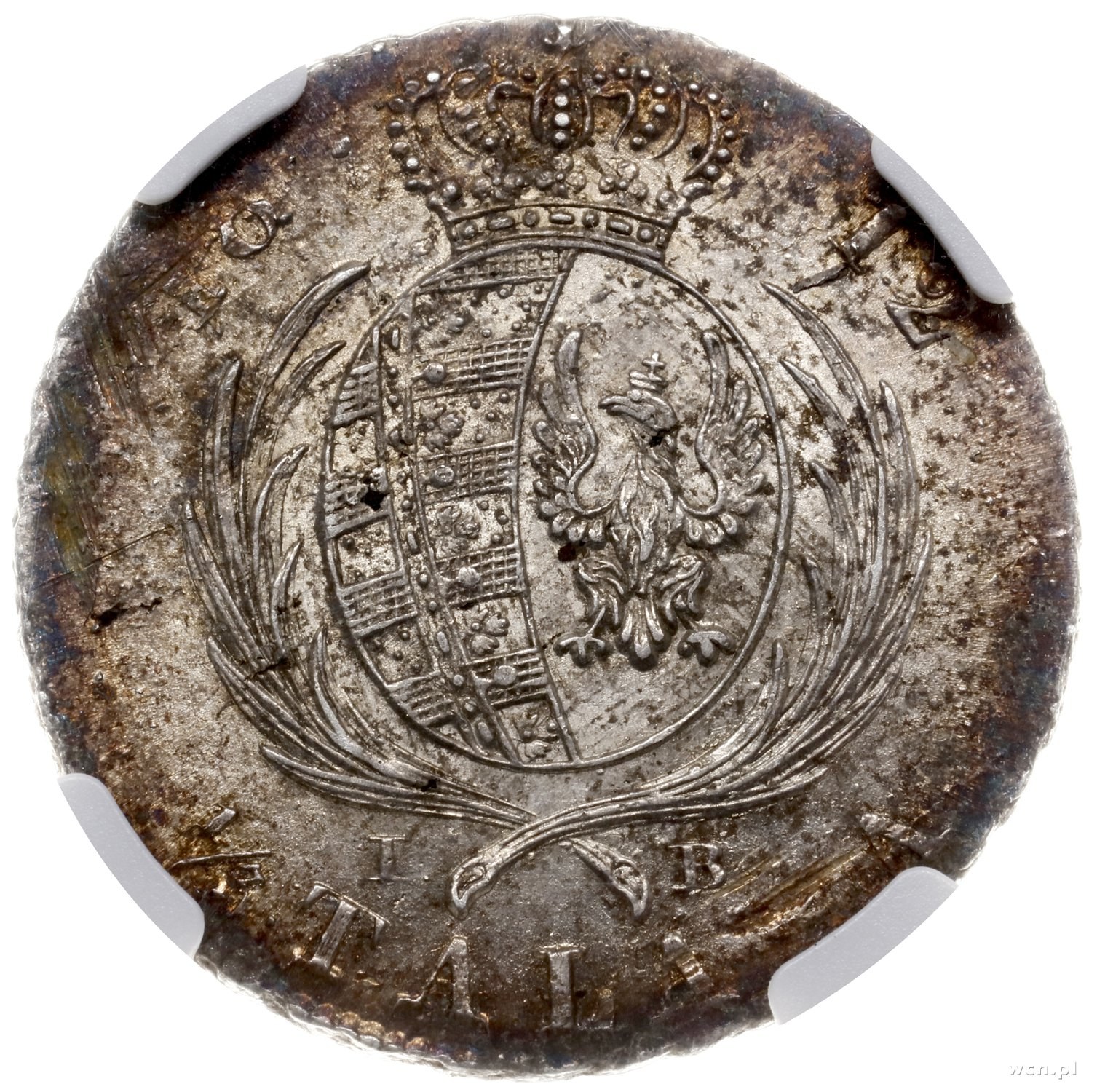 Fryderyk August I 1806-1827, dwuzłotówka (1/3 talara) 1812 IB, Warszawa; na rewersie u dołu inicjały I-B (Jakub Benicke); Kahnt 1269, Kop. 3697, Plage 111, Berezowski 3 zł; miedziana patyna, pięknie zachowana moneta w pudełku NGC 4785240-036 z oceną MS62