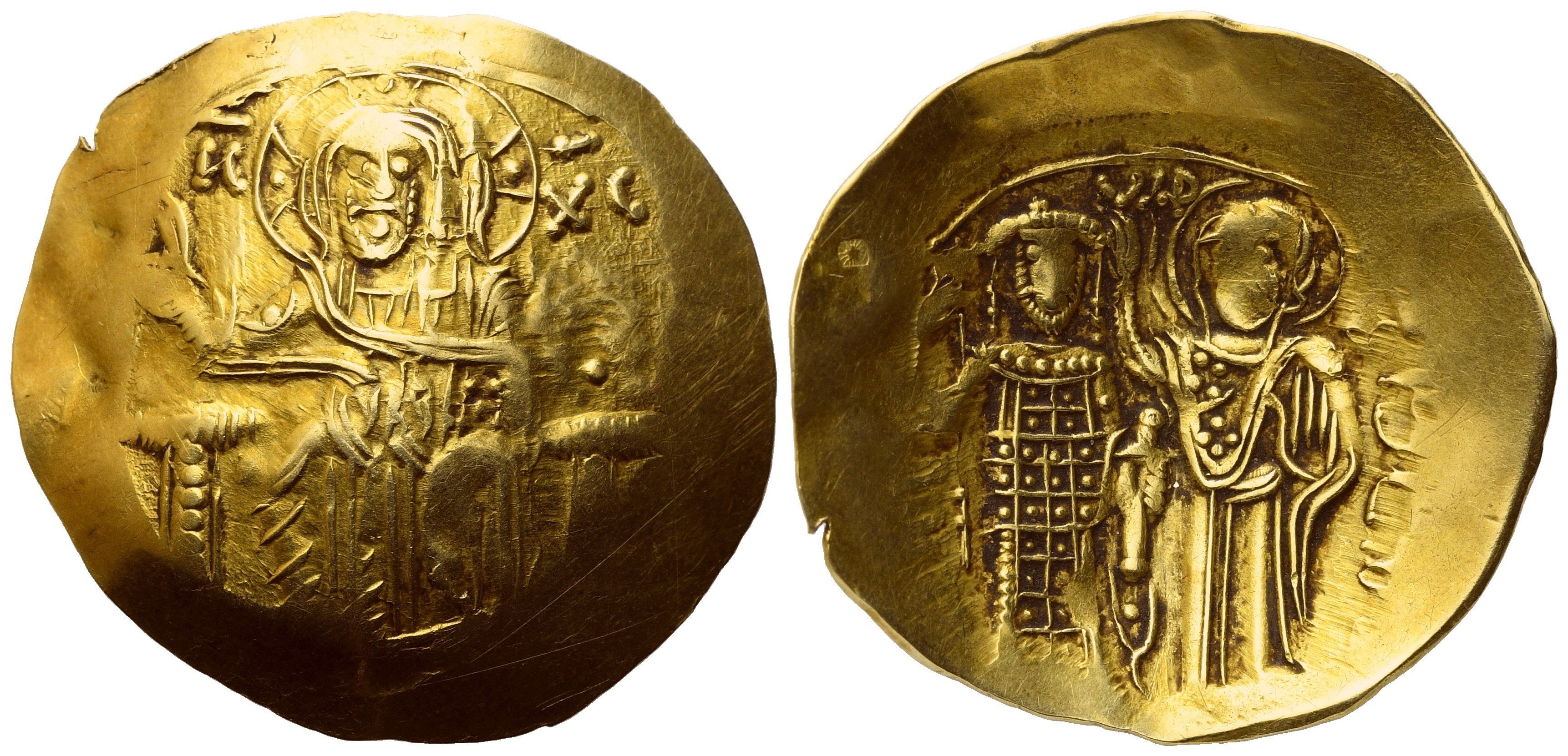 Christ, nimbate, seated facing on throne, wearing tunic and pallium, raising His right hand in benediction and holding book of Gospels in His left; in field to left and right, IC - XC; in field to left, cross; Rv./ John III standing facing on the left, wearing divitision and loros, holding anexikakia in his left hand and labarum in his right, crowned by the Virgin Mary, nimbate, standing facing on the right. DOC 4ff. SB2073.  About About extremely fine.
