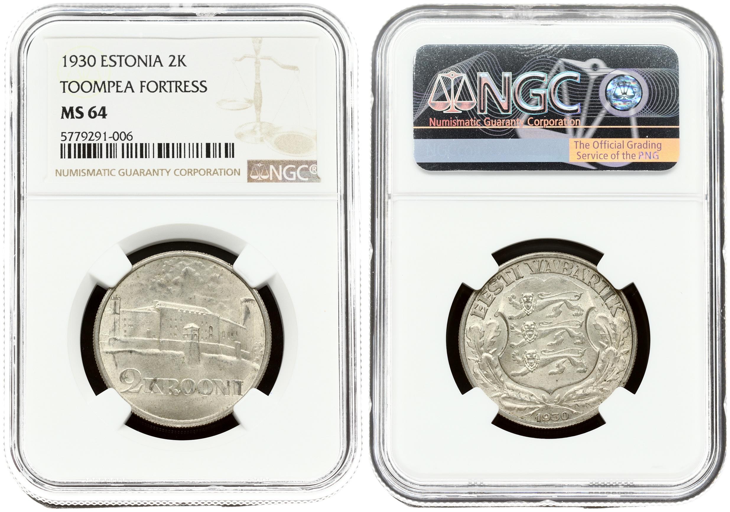 Estonia 2 Krooni 1930 Toompea Fortress at Tallinn. Averse: National arms wreath surrounds date below. Reverse: Castle denomination below. Edge Description: Milled. Silver. KM 20. NGC MS 64