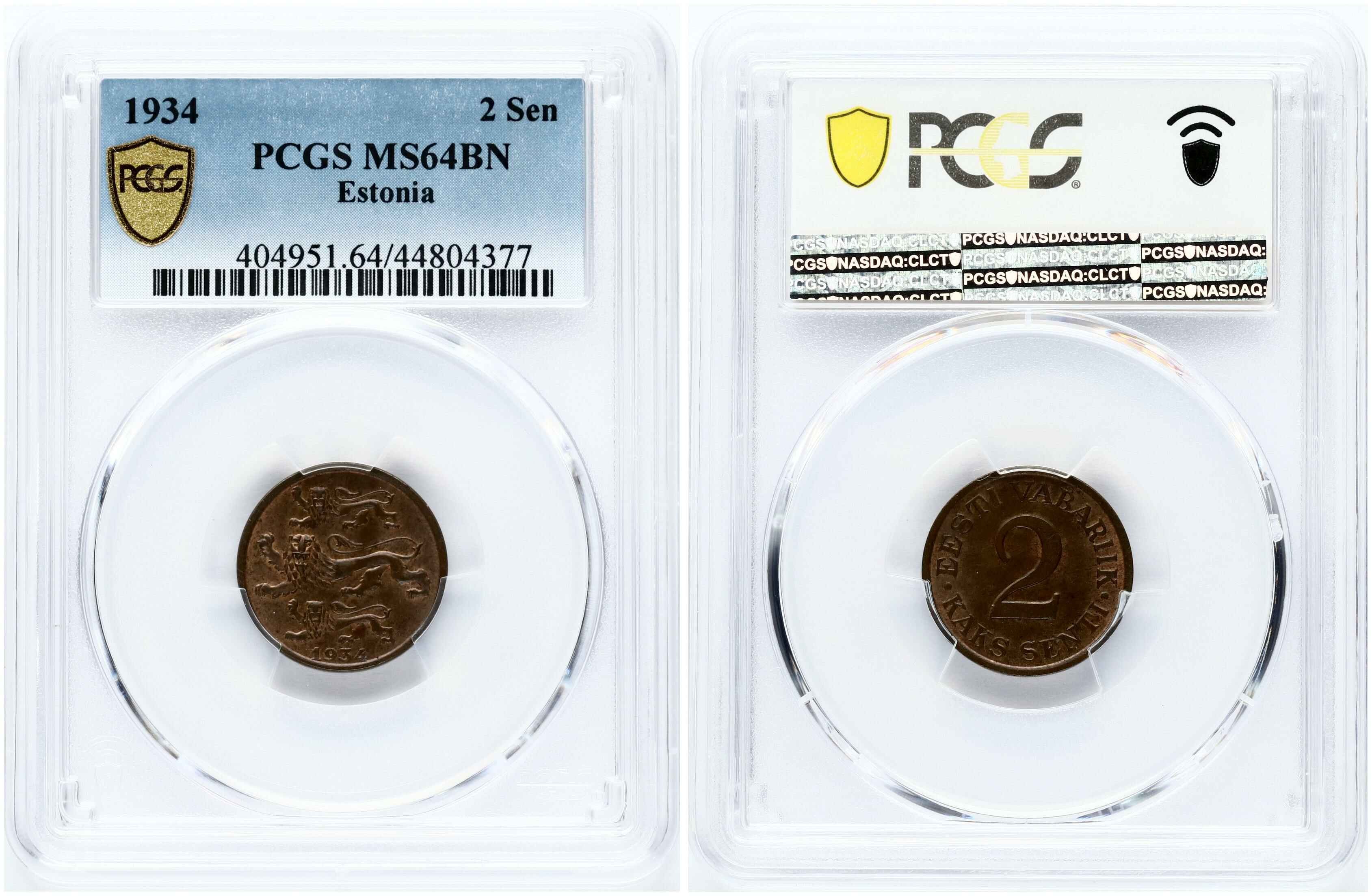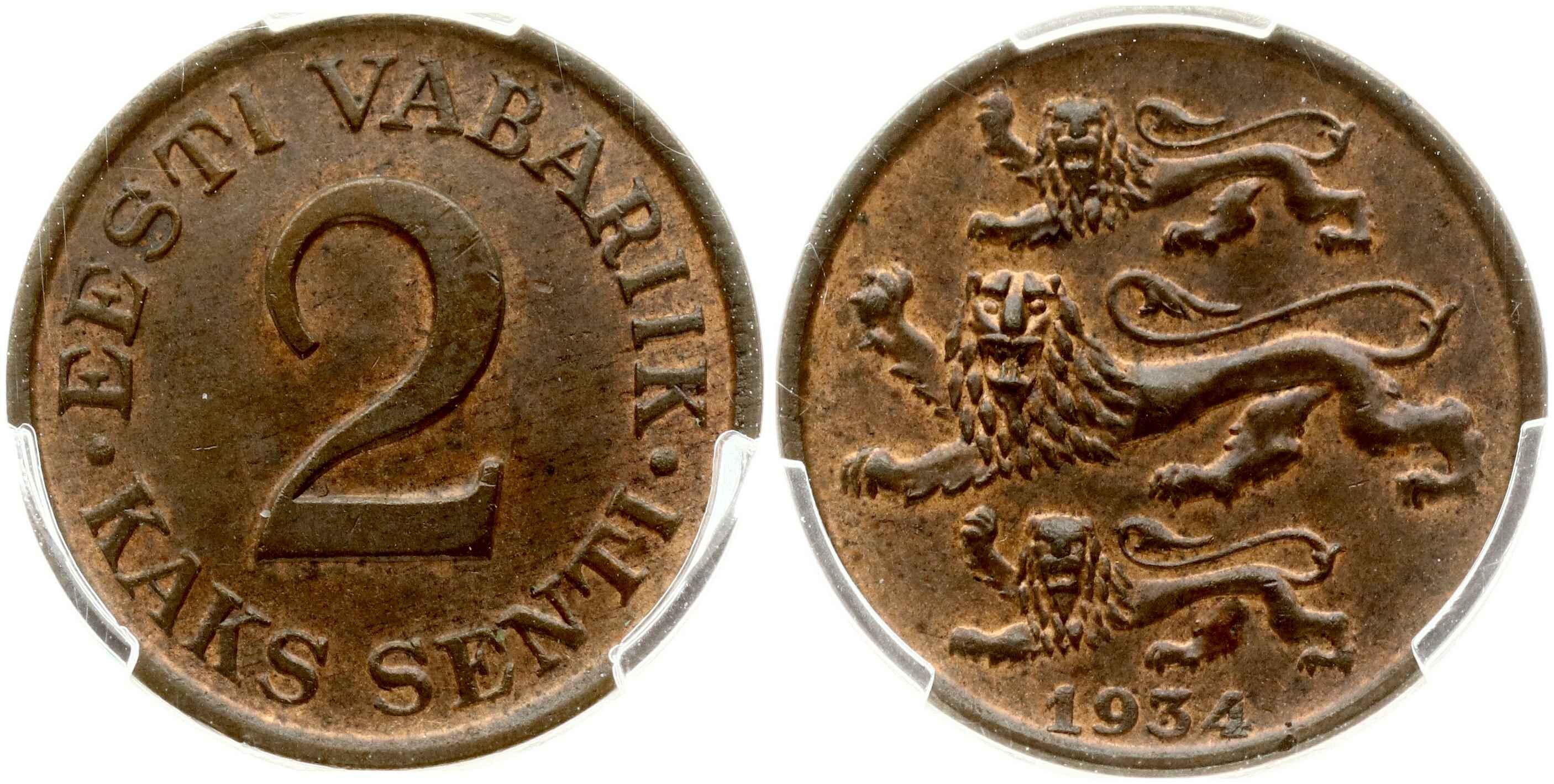 Estonia 2 Senti 1934 PCGS MS 64 BN ONLY ONE COIN IN HIGHER GRADE