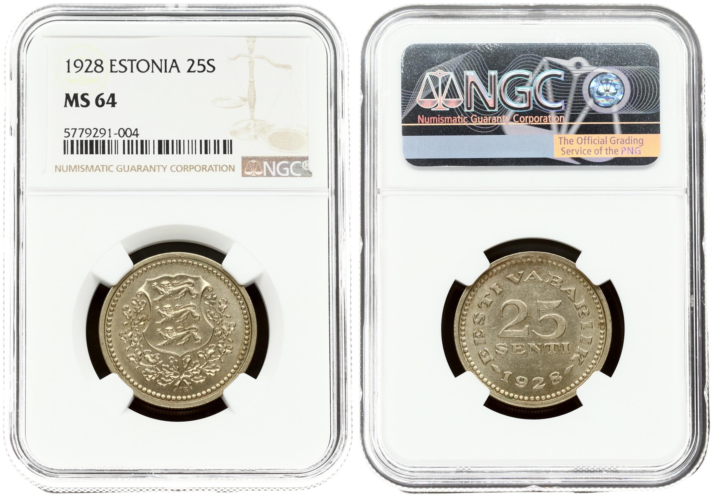 Estonia 25 Senti 1928 Averse: National arms wreath surrounds. Reverse: Denomination above date. Nickel-Bronze. KM 9. NGC MS 64 ONLY 5 COINS IN HIGHER GRADE