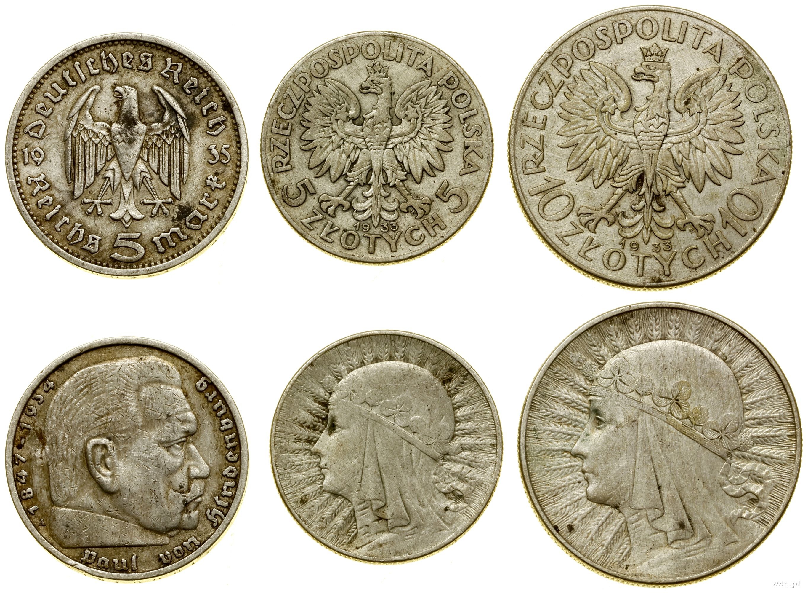 w skład zestawu wchodzi 10 i 5 złotych 1933 (głowa kobiety w czepcu) oraz 5 marek 1935 A (Paul von Hindenburg)