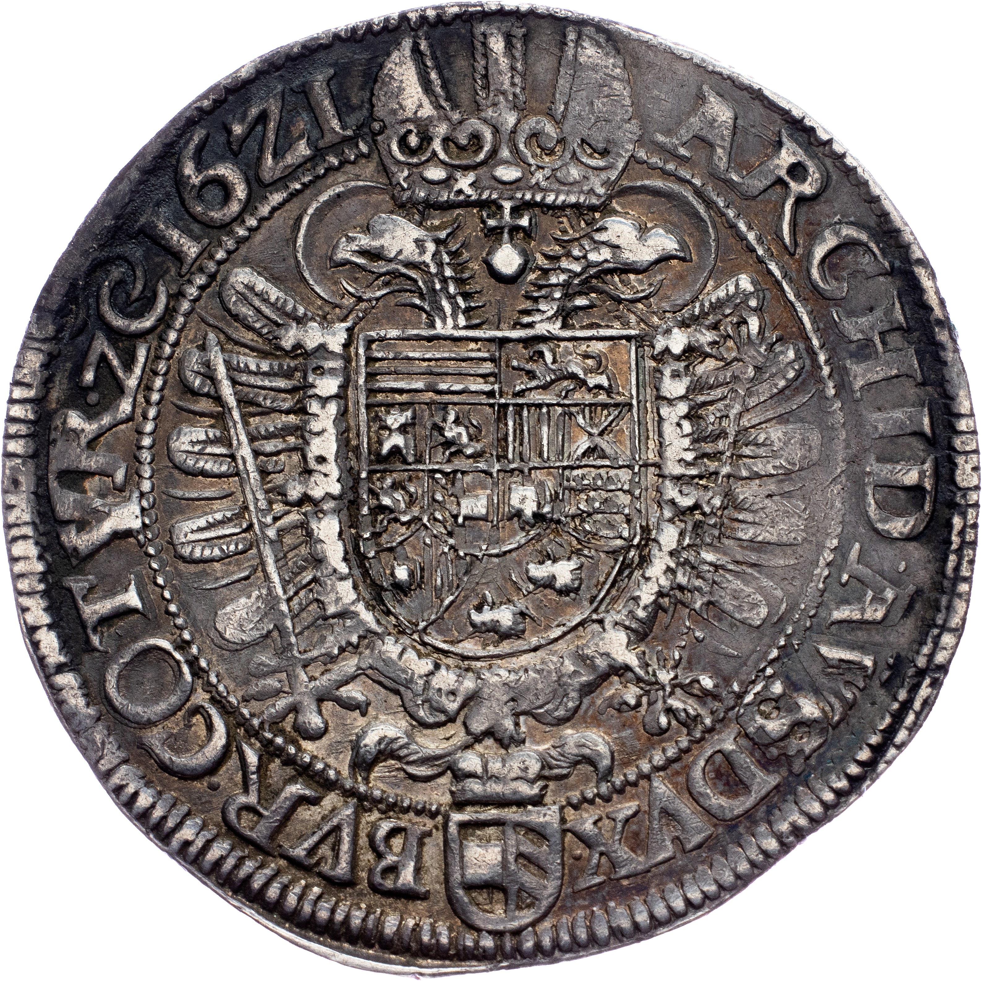 Austria-Hungary, Ferdinand II., 1 Thaler 1621, Vienna, 28,236 g, Ag, Dav. 3076, Traces of corrosion on the edge, toned; VF