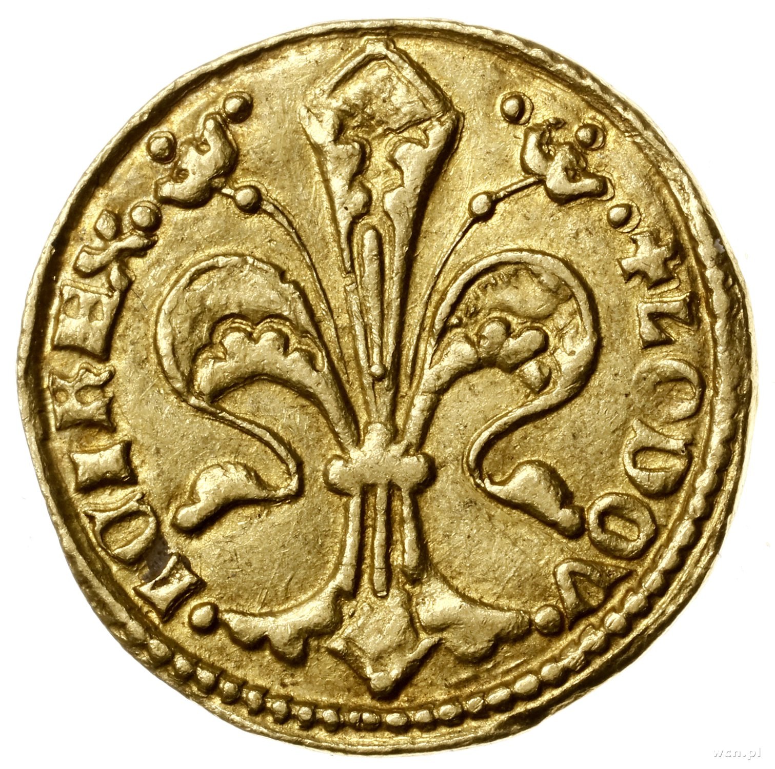 Ludwik I Andegaweński (1370–1382), Floren (goldgulden), 1342–1353, mennica Buda (?), mincerz Lóránd; Aw: Lilia, + LODOV - ICI REX; Rw: Postać św. Jana na wprost, w nimbie, w prawej ręce trzyma laskę krzyżową, S • IOHA - IIIIES B (korona); CNH.II 62, Fr. 3, Frynas H.25.1, Huszár 512, Pohl B1; złoto, 21.4 mm, 3.56 g.