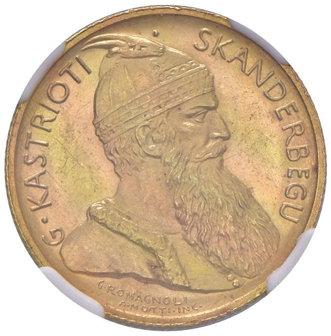 ALBANIA Zog I (1925-1939) 20 Franga 1926 R (fascetto) - Fr. 5 AU RRR Di questa moneta, battuta nella zecca di Roma con un piccolo fascio accanto alla R, furono battuti soltanto 100 esemplari, 90 dei quali subito rifusi. In slab NGC MS 63 cod. 6643251-010