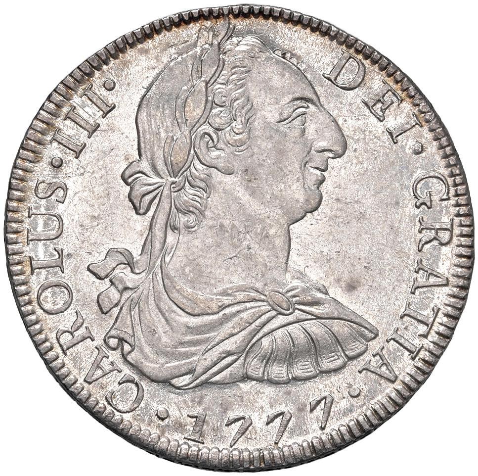 Carlo III (1759-1788) Messico - 8 Reales 1777 Mo FM - KM 106; Cal. 1112 AG (g 27,00) Esemplare in altissima conservazione con fondi ancora lucenti. Graffietti e minimi segnetti al D/