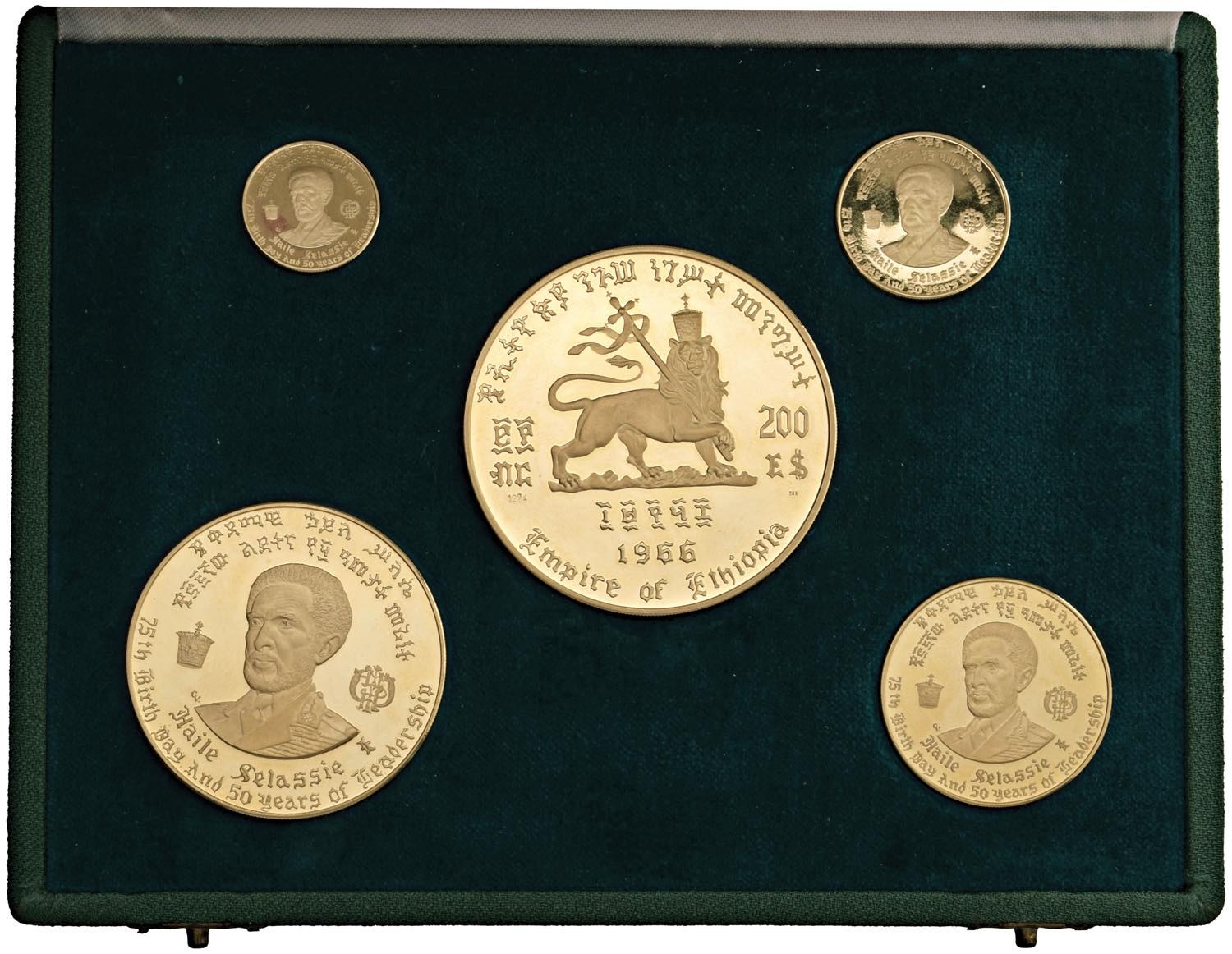 ETIOPIA Haile Selassie I (1941-1974) 200, 100, 50, 20 e 10 Dollari 1966 - KM 42, 41, 40, 39 e 38 AU (g 79,84 + 40,24 + 20,24 + 8,08 + 4,10) Set di 5 monete in astuccio con certificato come da foto. Il 200 Dollari presenta un graffietto al D/