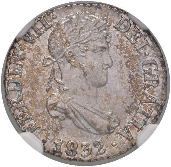 Ferdinando VII (1808-1833) Sevilla - Mezzo real 1832 JB - KM 482.3; Cal. 466 AG In slab NGC Ms 65 cod. 3126226-017