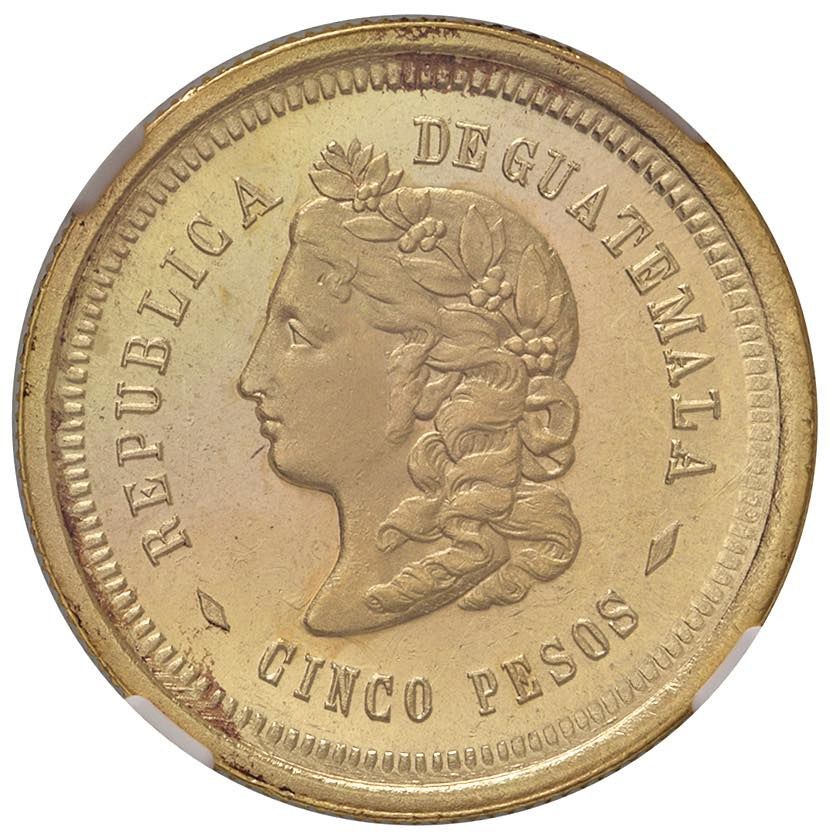 Foreign coins - GUATEMALA 5 Pesos 1874 - KM 198 AU In slab NGC MS 65 co...