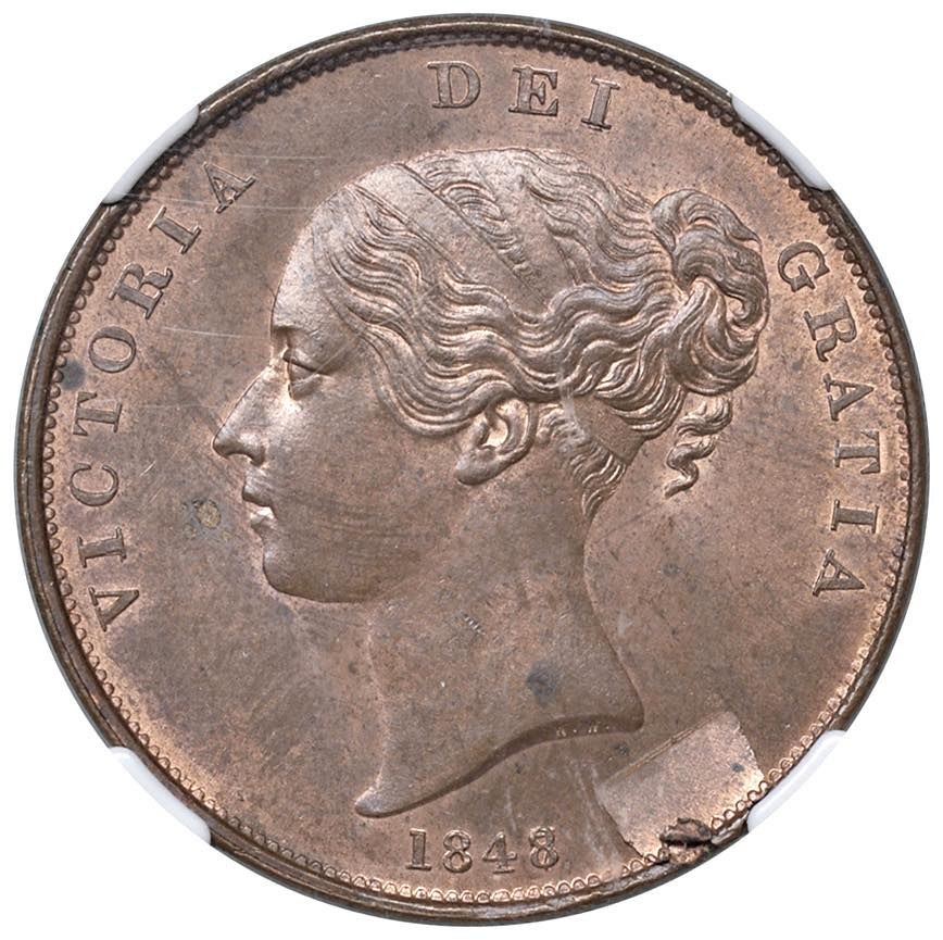 INGHILTERRA Vittoria (1837-1901) Penny 1848/7 - KM 739 CU In slab NGC MINT ERROR MS 64 RB OBVERSE LAMINATION cod. 3069745-014