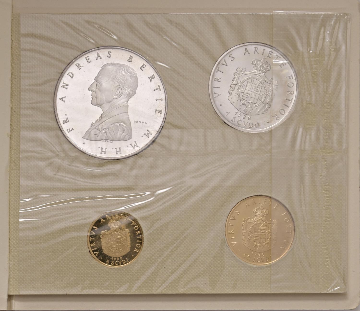 MALTA SMOM Andreas Bertie (1988-2008) Set PROVA 1988 di 4 monete in blister: 10 Scudi, 5 Scudi, 2 Scudi e 1 Scudo - Fr. 19 e 12 AU (g 12) e AG (g 35,8) RRRR