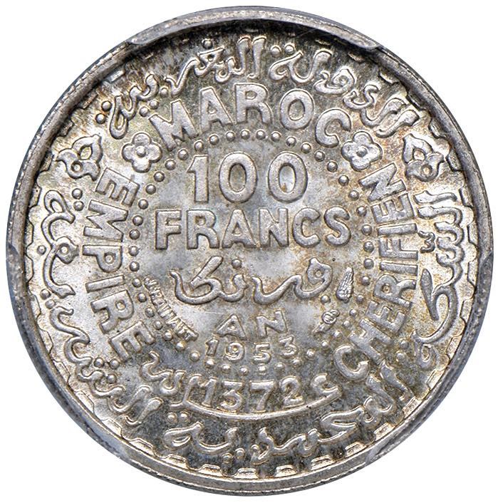 MAROCCO Mohammed V (1927-1957) 100 Franchi 1372 / 1953 - KM Y52 AG In slab PCGS MS 66 cod. 418543.66/44896238