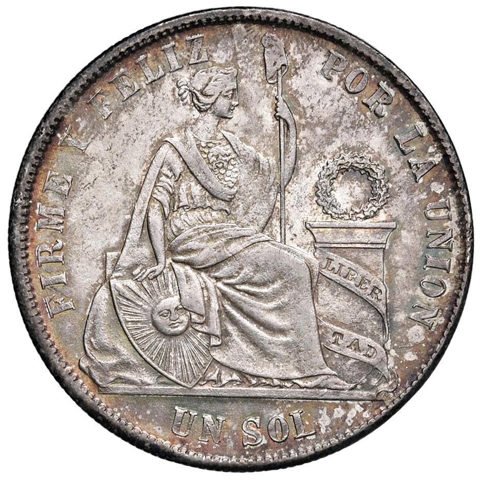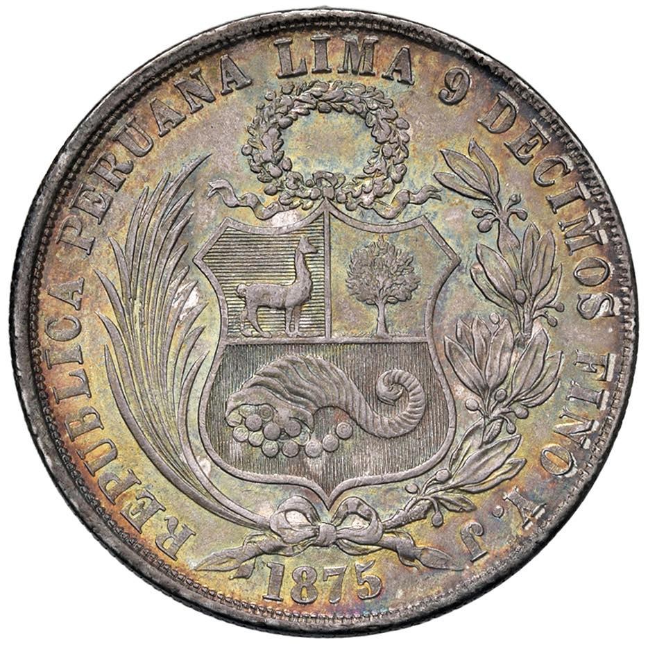 PERU Sol 1875 YJ - KM 196.3 AG (g 25,00) Esemplare in conservazione eccezionale corredato da una stupenda patina iridiscente