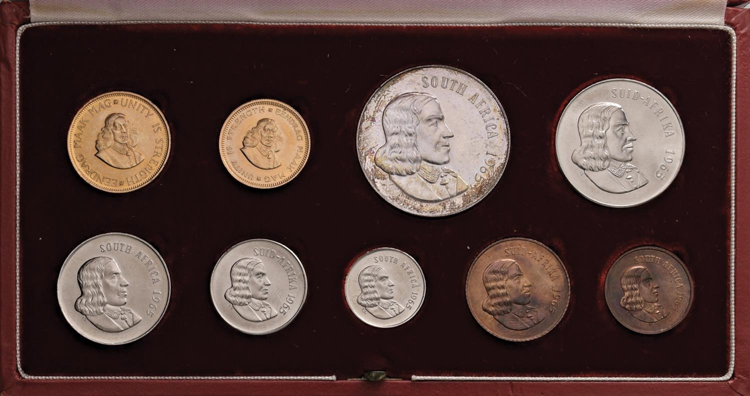 SUDAFRICA Divisionale 1965 - AU (g 7,99 + 4,00) e altri valori Lotto di nove monete in astuccio (un poco danneggiato)