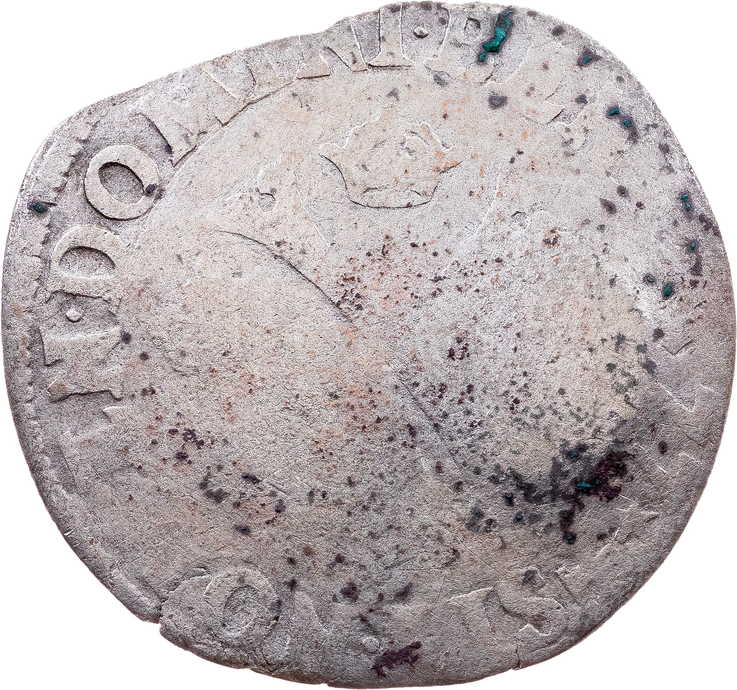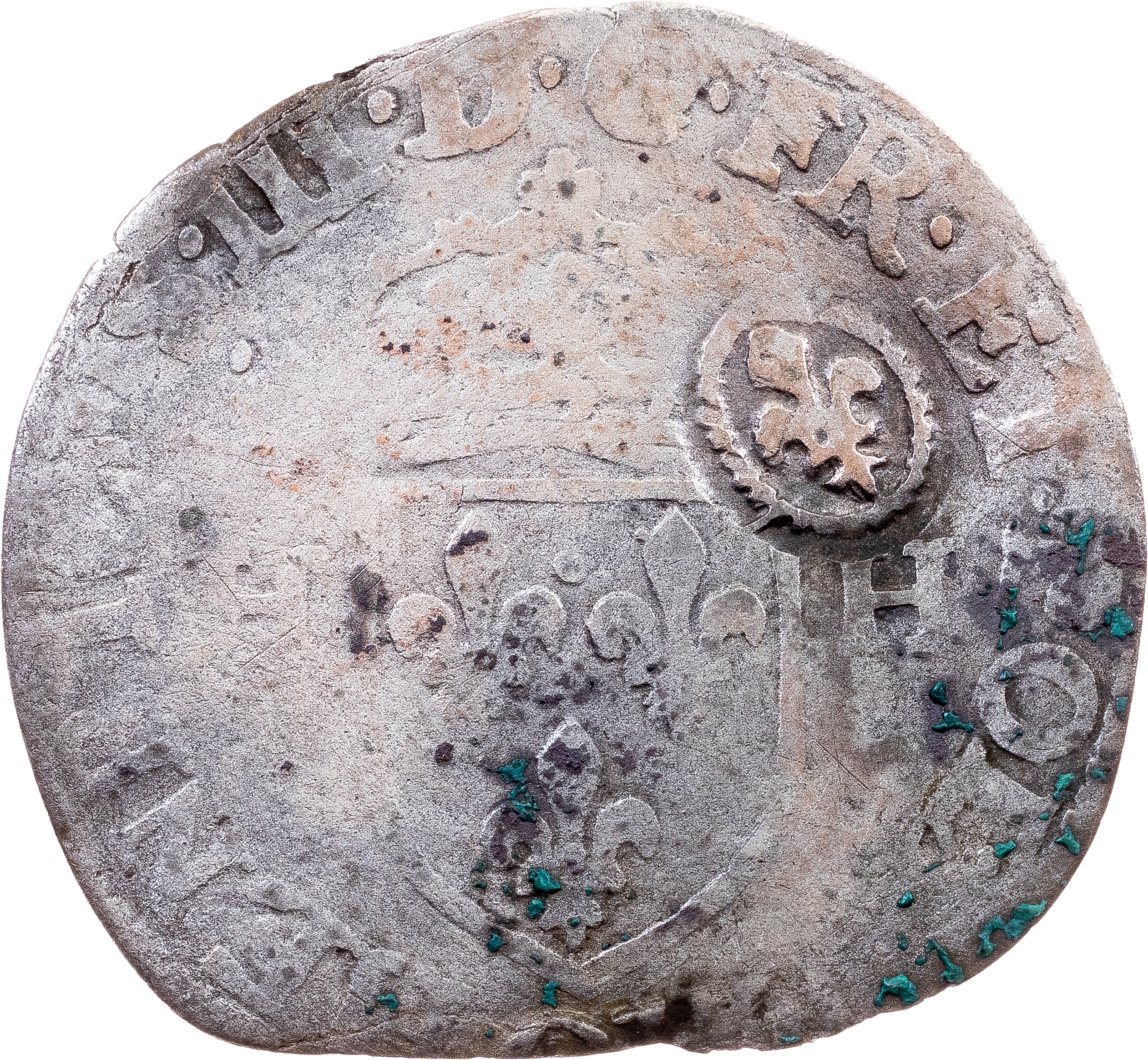 Description: Lily countermark on a Douzain of Henri III. (Dy royales 1140). It was countermarked with in accordance with the ordinance of June 1640, giving it a value of 15 deniers instead of 12.