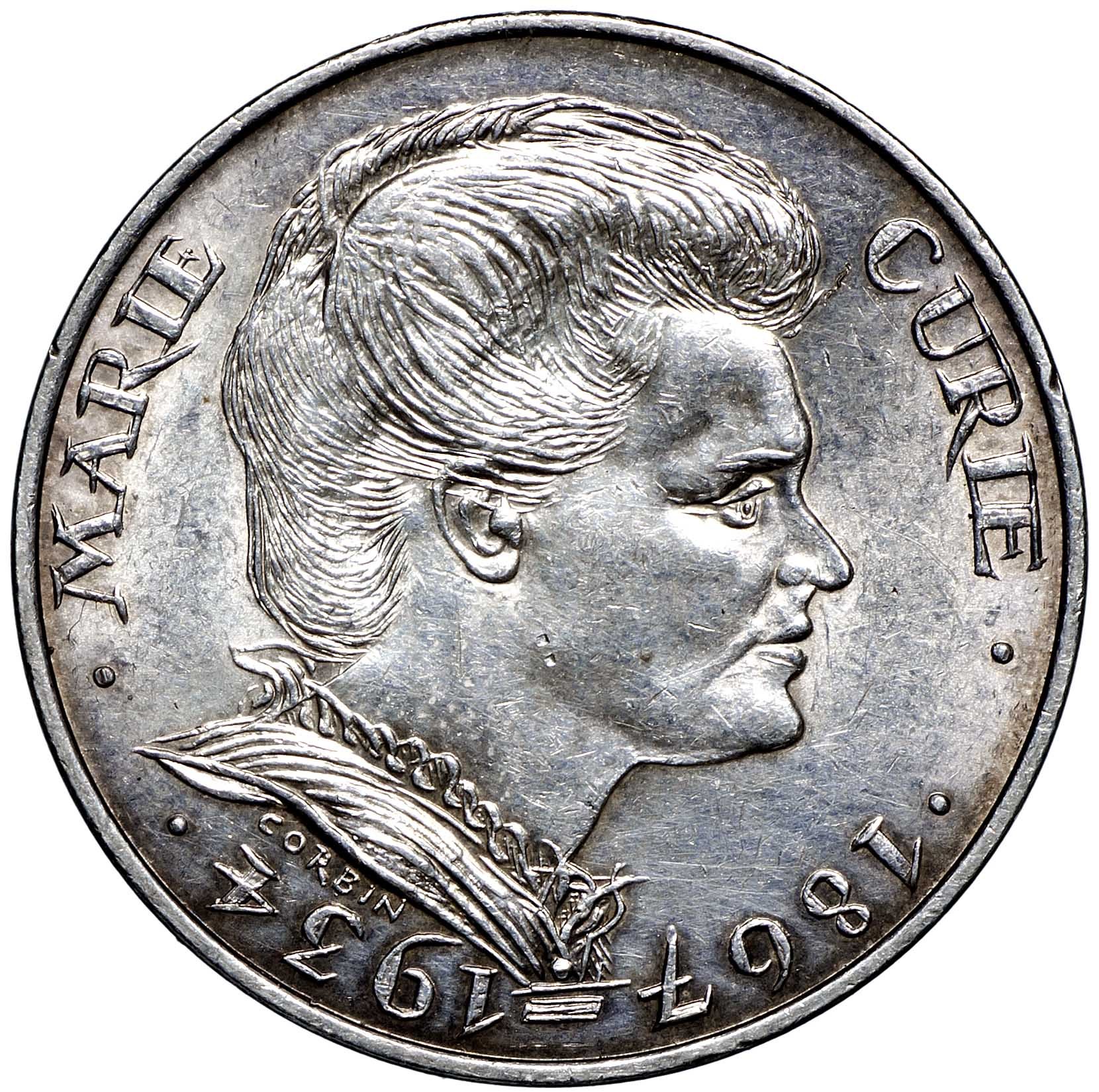 Moneta wybita z okazji 50-lecia śmierci Marii Skłodowskiej-Curie.