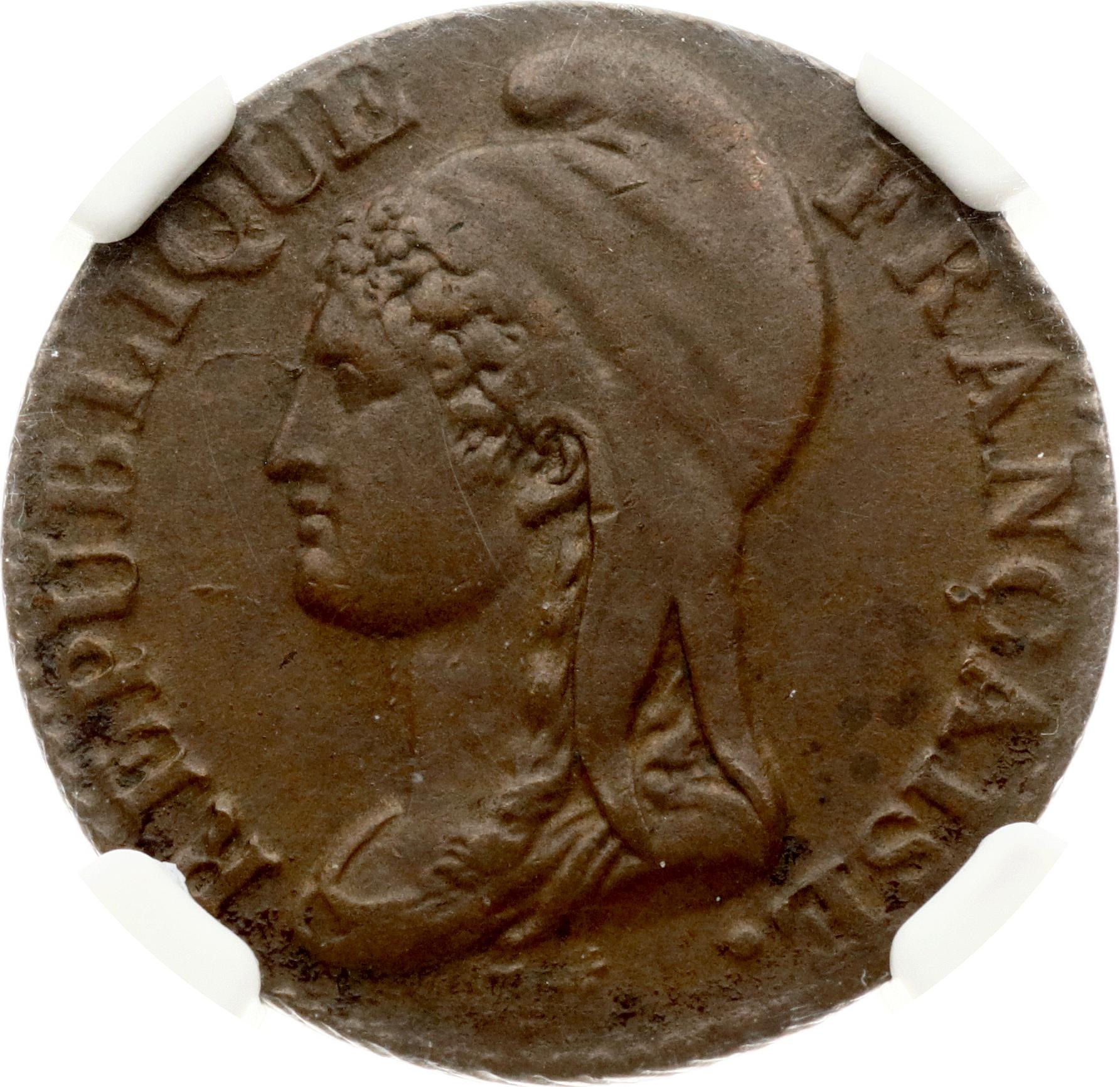 France. 5 Centimes L' AN 4 (1795-1796) A, Paris. Copper. KM 635.1. NGC AU 58 BN.
