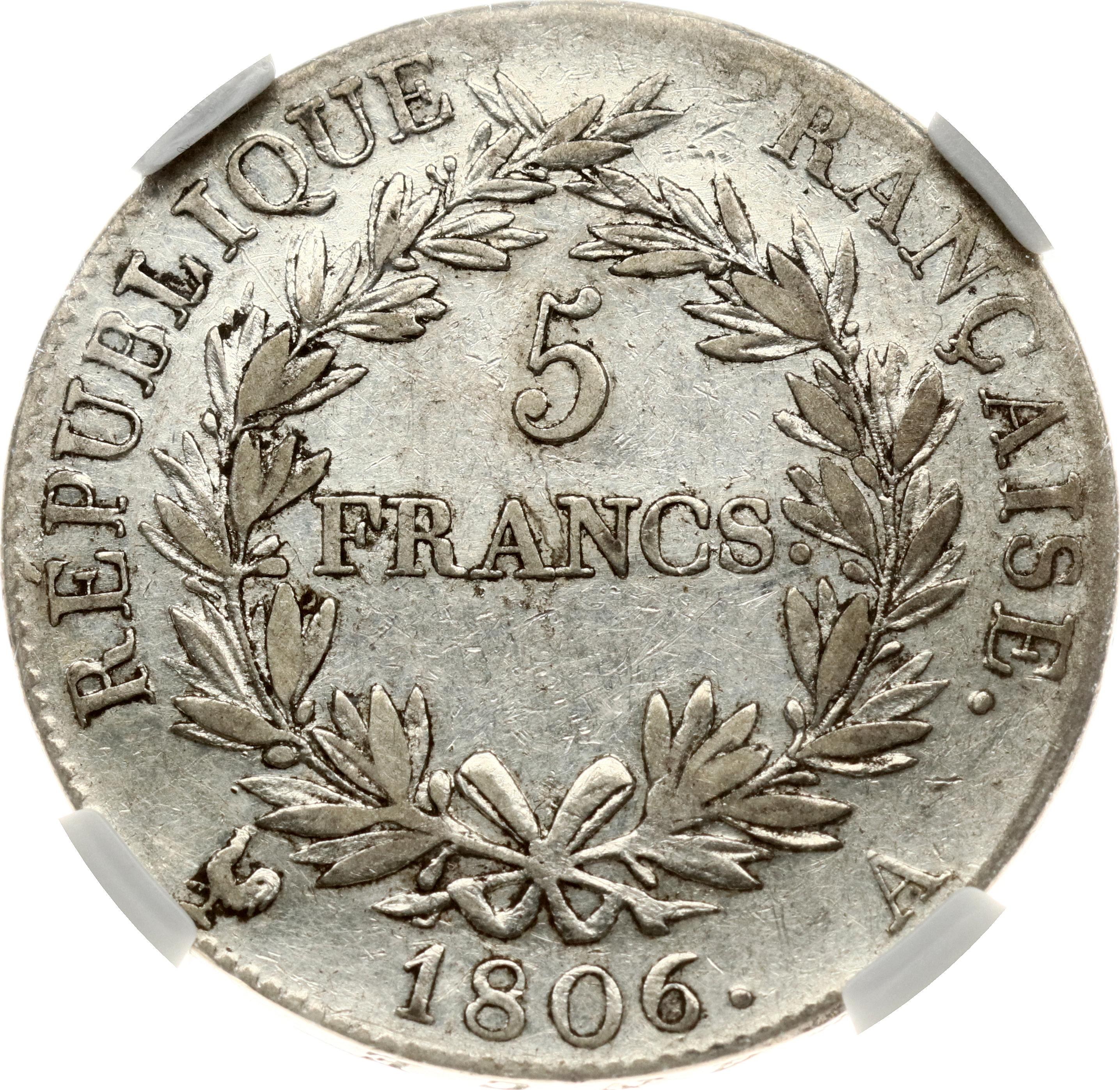 France. Napoleon I (1804-1814, 1815). 5 Francs 1806 A, Paris. Silver. KM 673. NGC XF 40.