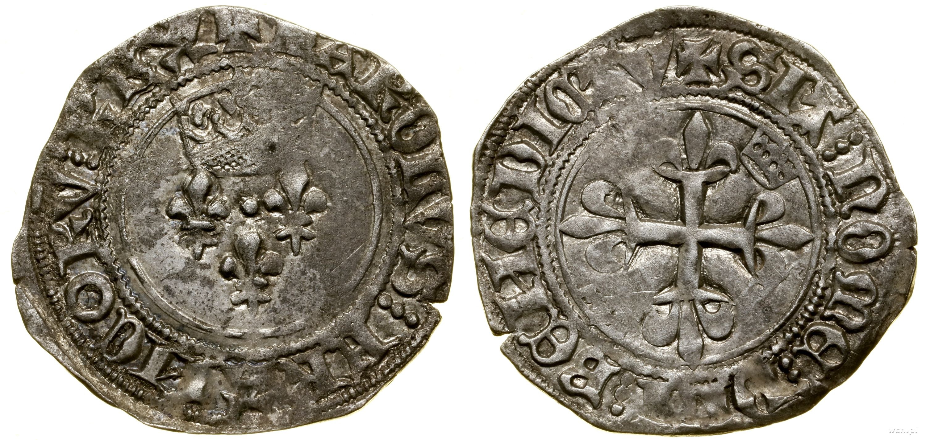 Aw: Trzy lilie pod koroną, + KAROLVS ⋮ FRANCORV ⋮ REX, Rw: Krzyż liliowaty, w dwoch przeciwległych kątach korony, + SIT ⋮ NOME ⋮ DNI ⋮ BEИEDICTV
