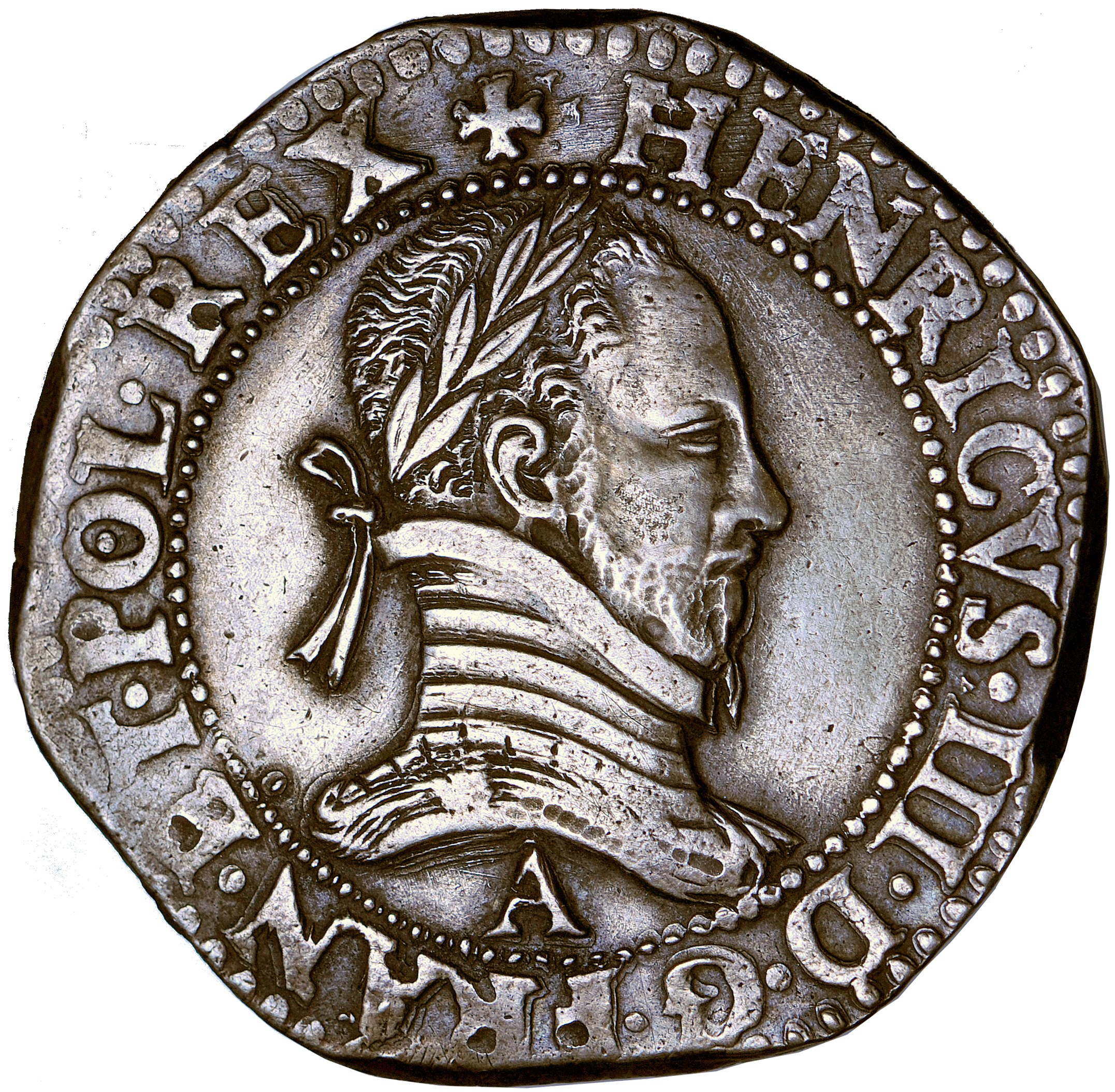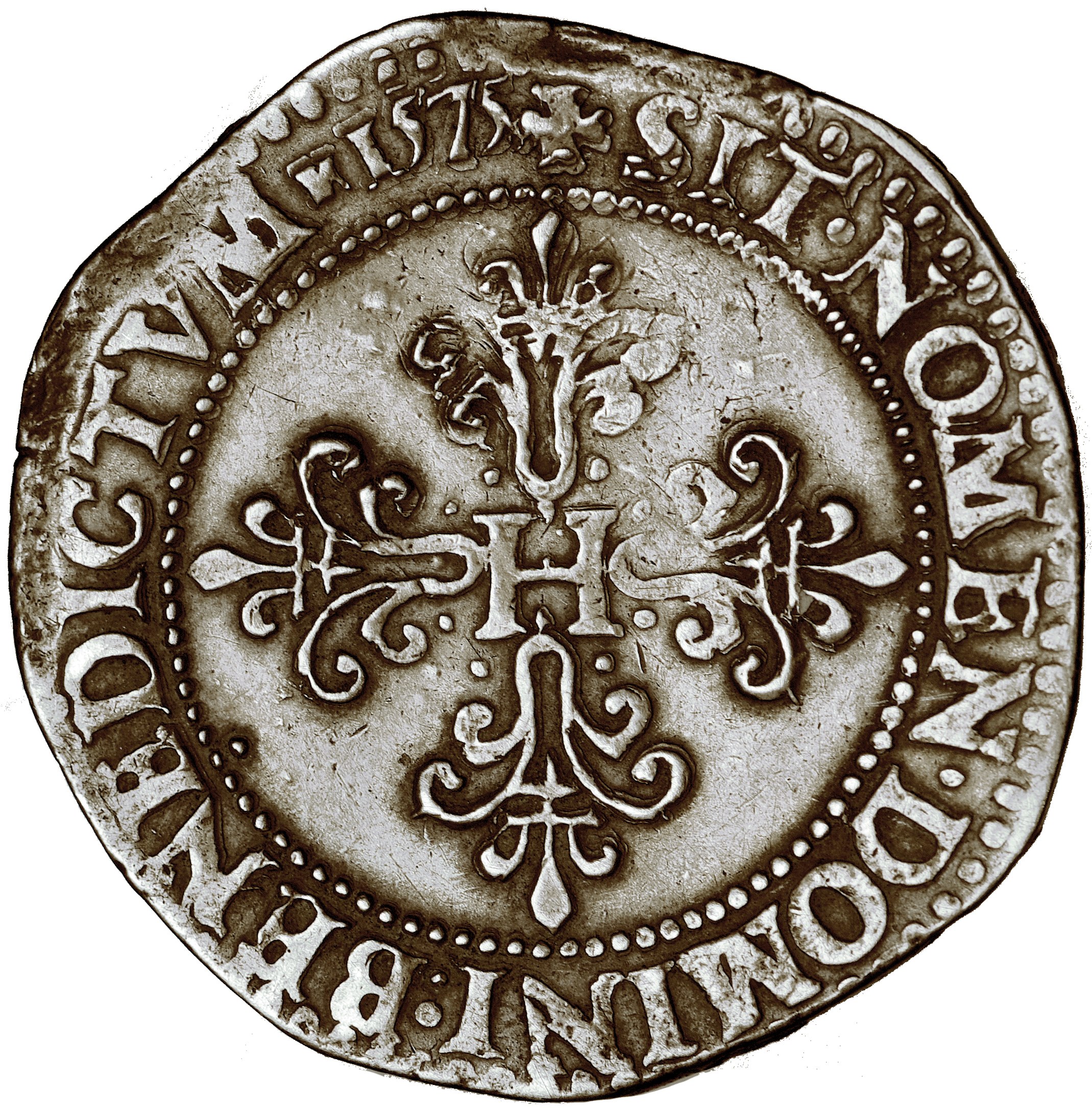 W 1575 roku (roku wprowadzenia franka do mennictwa) typ z datą na rewersie bito tylko w Paryżu i jest wyjątkowo rzadki (w katalogu Kopickiego rr). Portret króla niespotykanej jakości.