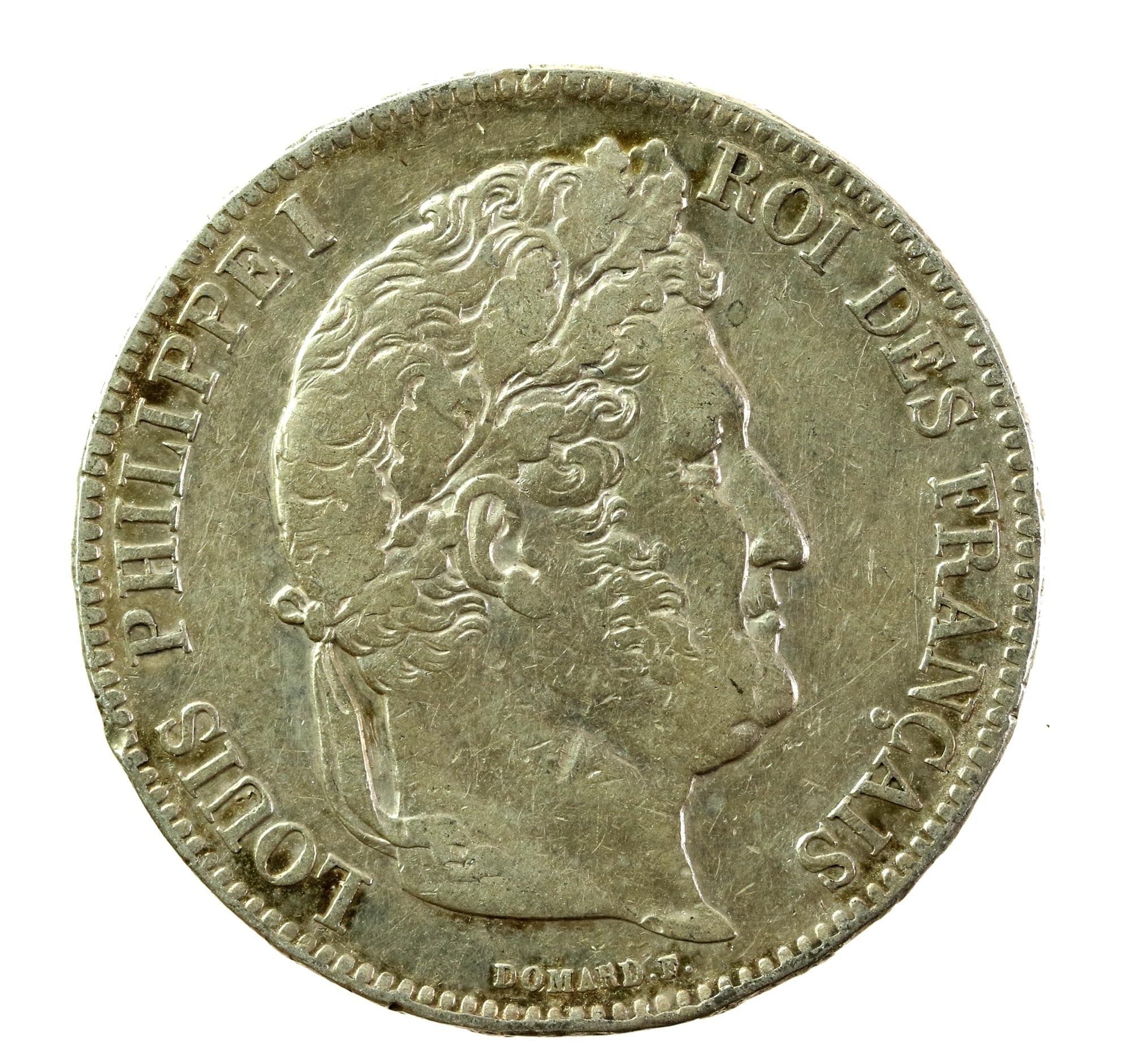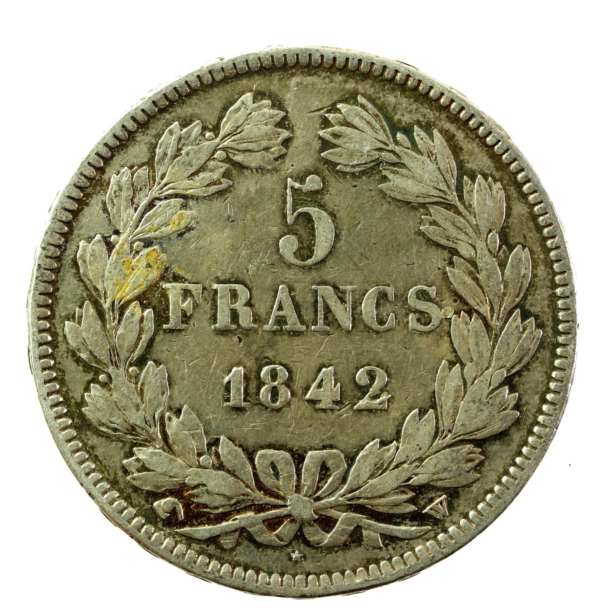 Francja, Ludwik Filip I, 5 franków 1842 W, Lille. Srebro 900, waga katalog. 25,00 grama. Stan 3+. Dobrze zachowany egzemplarz. Patyna.