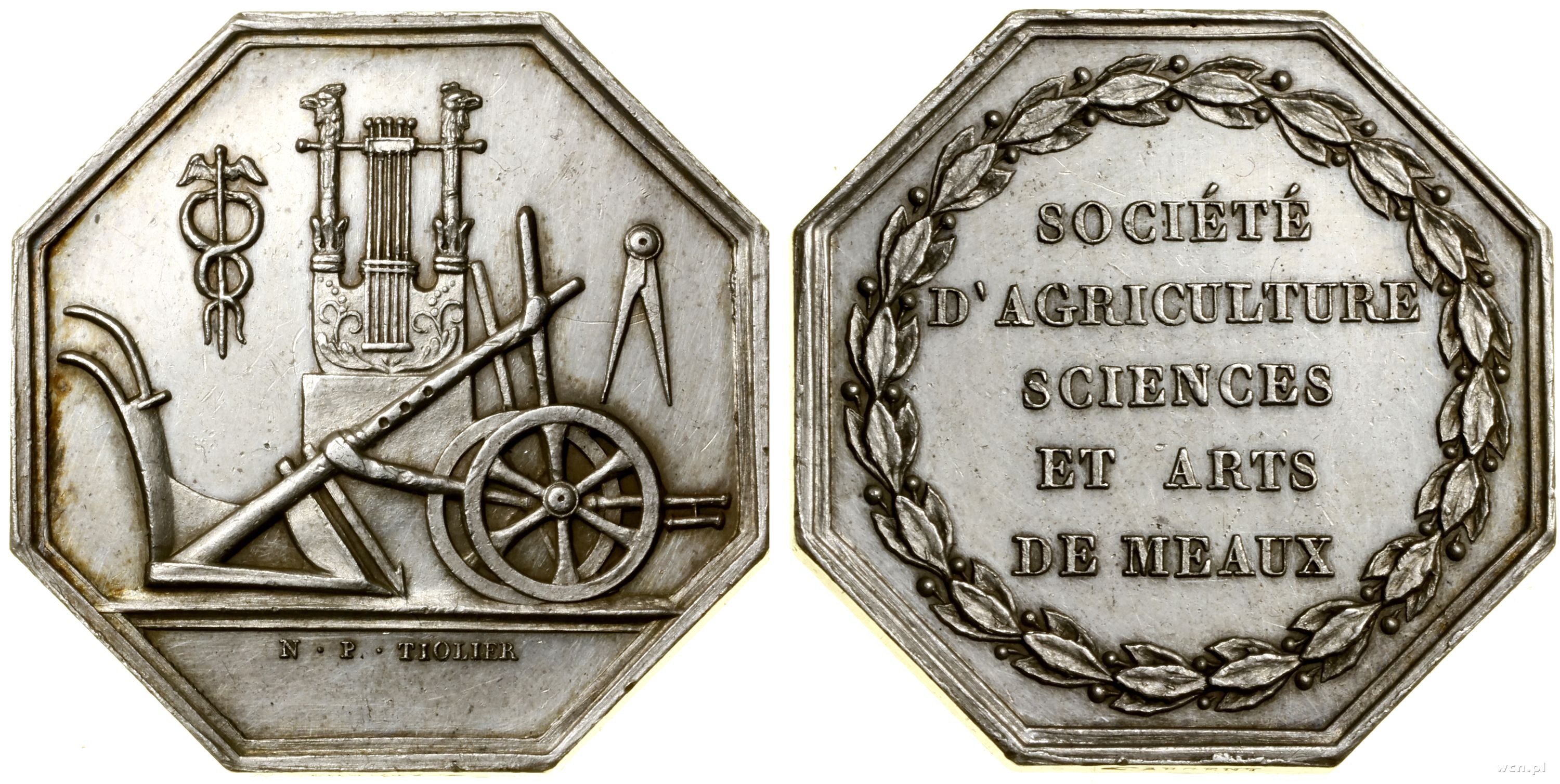 Aw: Pług, za nim lira, kaduceusz i cyrkiel, na dole sygnatura N • P • TIOLIER, Rw: Wieniec, w którym SOCIÉTÉ / D' AGRICULTURE / SCIENCES / ET ARTS / DE MEAUX, Obrzeże: Punca ARGENT