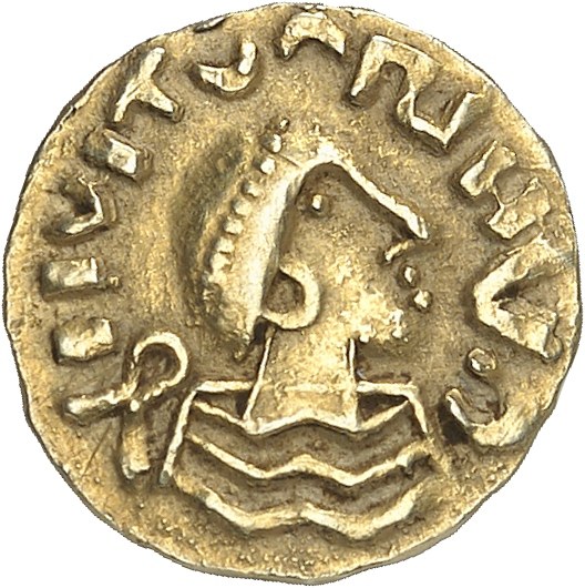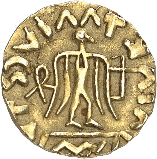 Type à la victoire et légende immobilisées, avec boucle au droit et au revers, avec possible attribution au Lyonnais vers 580. Flan assez large, en or pâle. De très beau style. À peine nettoyé. TTB à Superbe.
