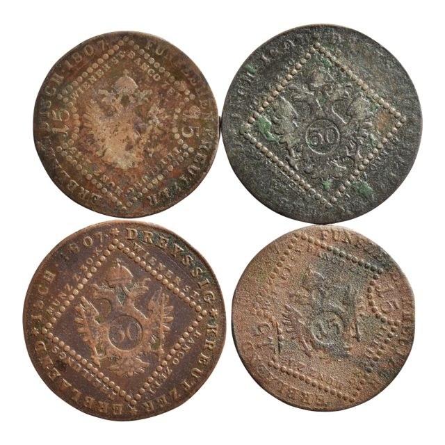 Cu 30 krejcar 1807 A, 15 krejcar 1807 A, velká a malá značka u obou nominálů, 4 ks