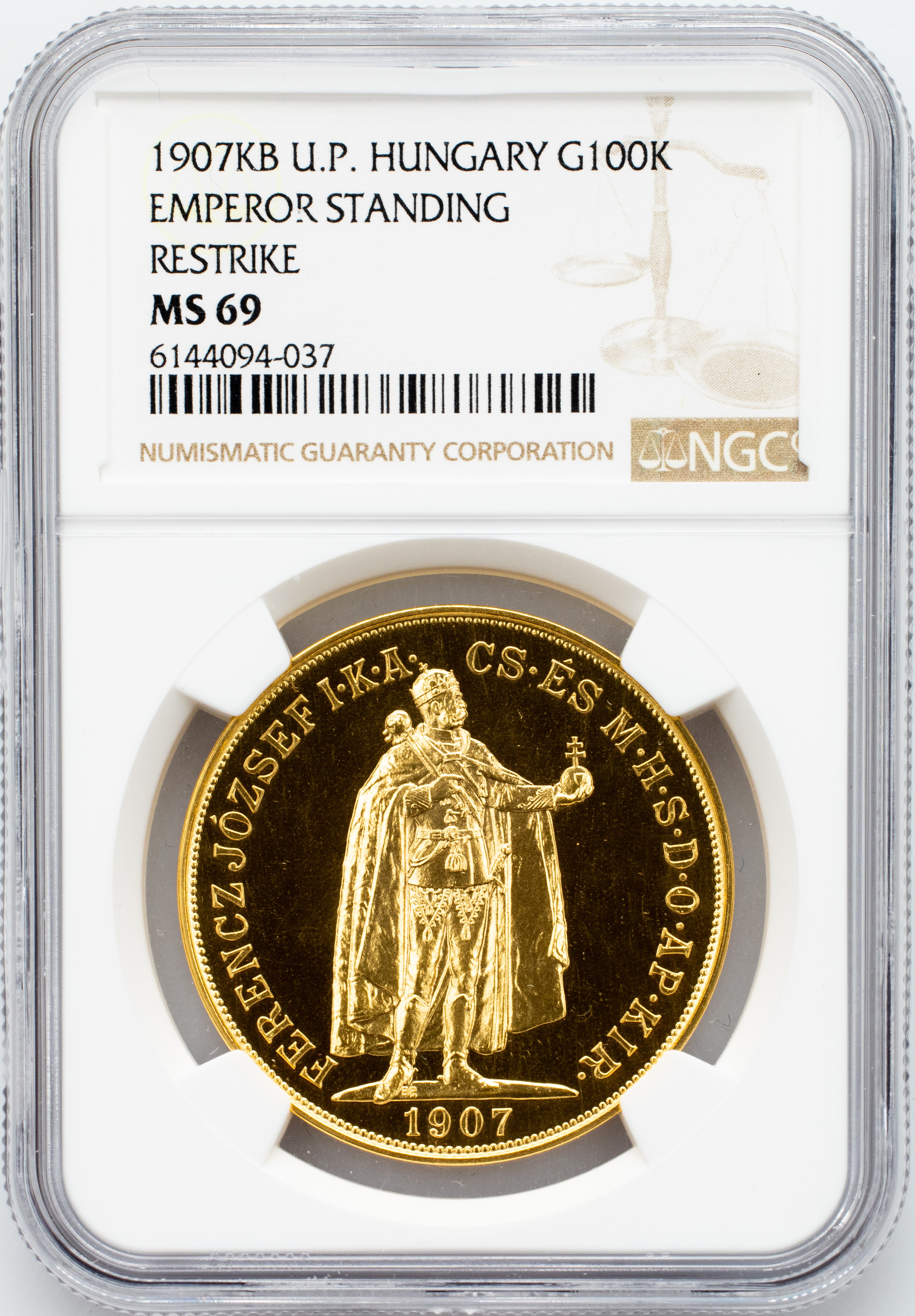 Habsburg, Franz Joseph I., 100 Korona 1907, U.P, KB, Kremnitz, 33,8 g, Au (900/1000), KM# 491, Modern restrike; NGC MS69