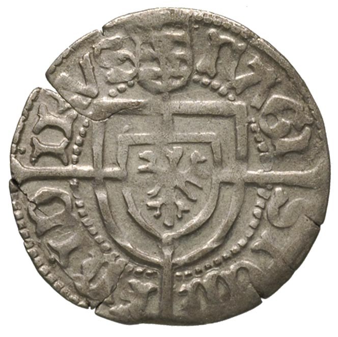 ZAKON KRZYŻACKI, Fryderyk Saski 1498-1510, szeląg, Aw: Tarcza wielkiego mistrza na długim krzyżu, w otoku napis, Rw: Tarcza zakonna na długim krzyżu i napis w otoku, srebro 1.38 g, Vossberg 1126, Neumann 33, rzadki