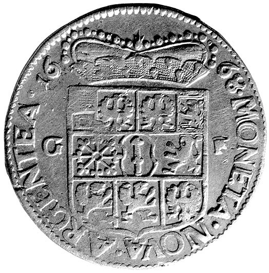 PRUSY, Fryderyk Wilhelm 1640-1688, półgulden 1668, Krosno, Aw: Popiersie, Rw: Tarcza herbowa, w polu litery G-F, Schr.560