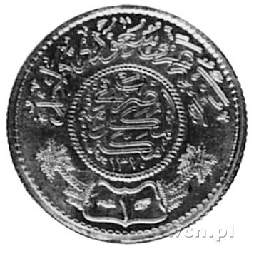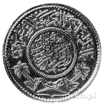 ARABIA SAUDYJSKA, funt 1951, Aw: Napisy arabskie w centrum i w otoku, niżej herb; dwa skrzyżowane miecze, Rw: Napisy arabskiew centrum i na obwodzie, poniżej w tarczy nominał, Fr.1