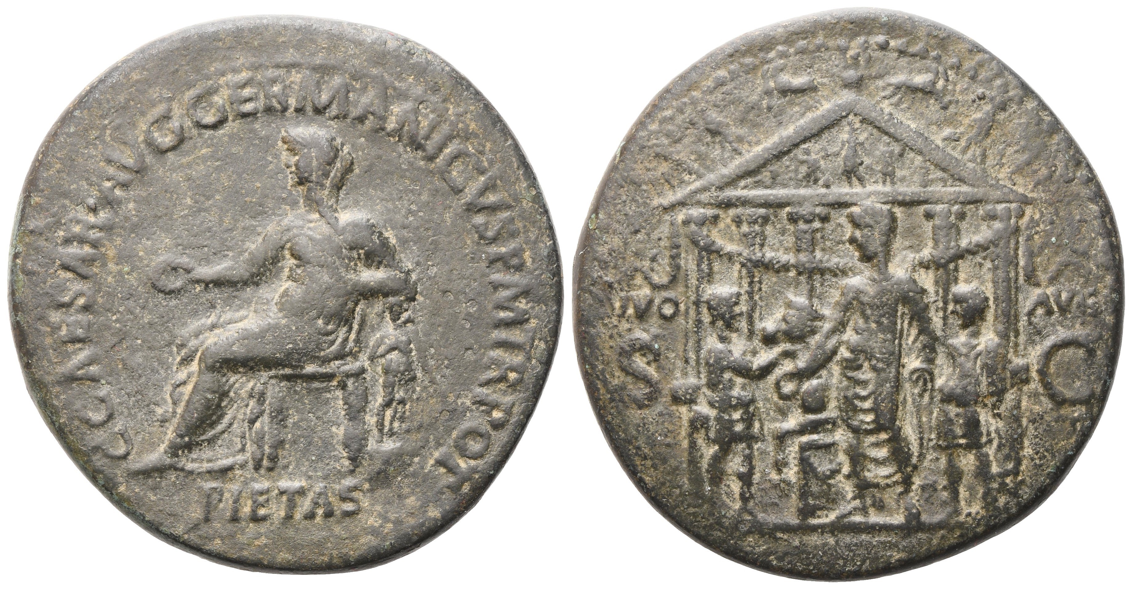 C·CAESAR·AVG·GERMANICVS P·M·TR·POT Pietas, veiled and draped, seated l., holding patera and resting l. arm on small facing figure; in exergue, PIETAS; Rv. DIVO – AVG / S – C Gaius, veiled and togate, sacrificing over garlanded altar; in the background hexastyle temple. C 9. BMC 41. RIC 36. CBN 51. Brown patina with lighter highlights. About gVF