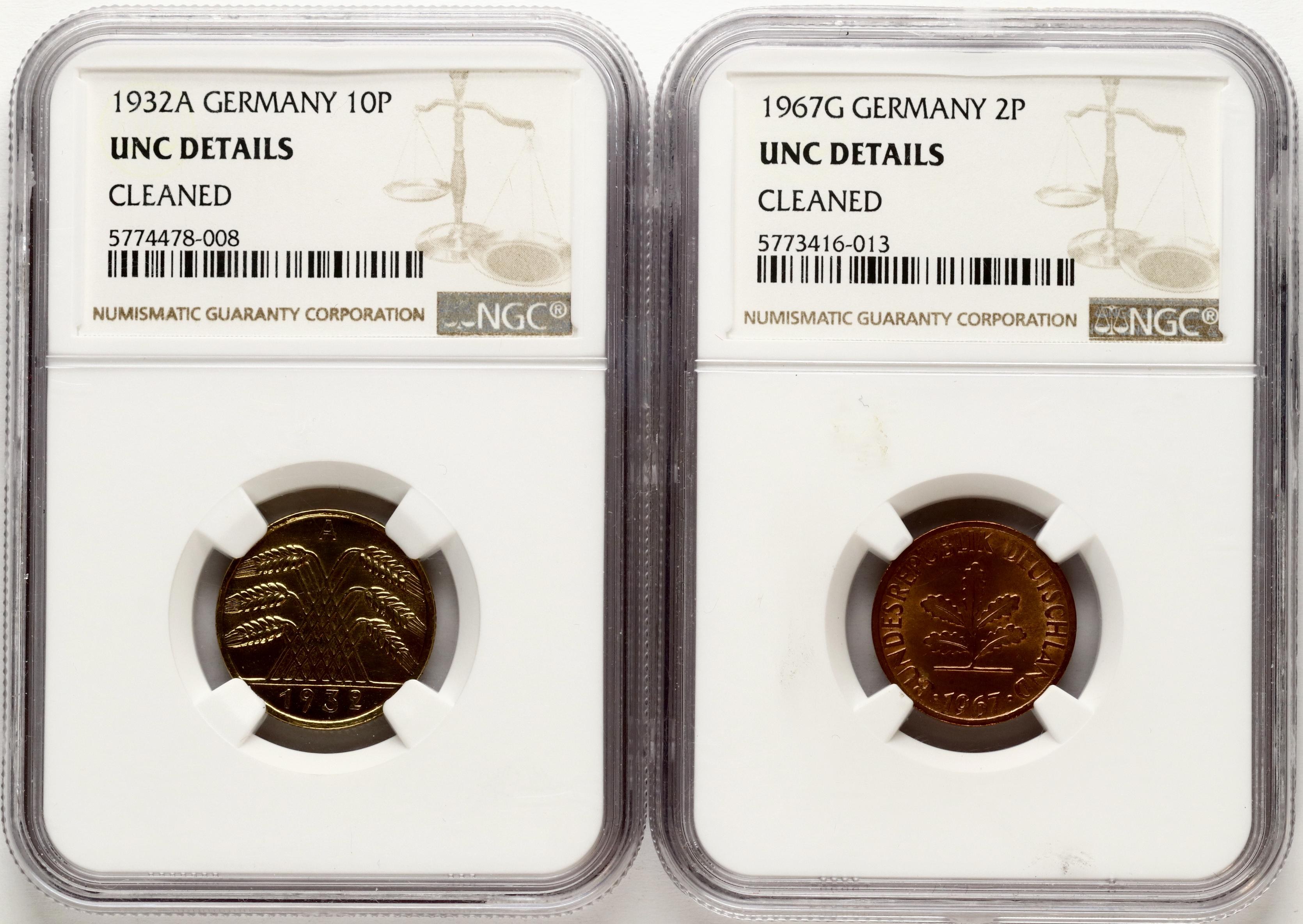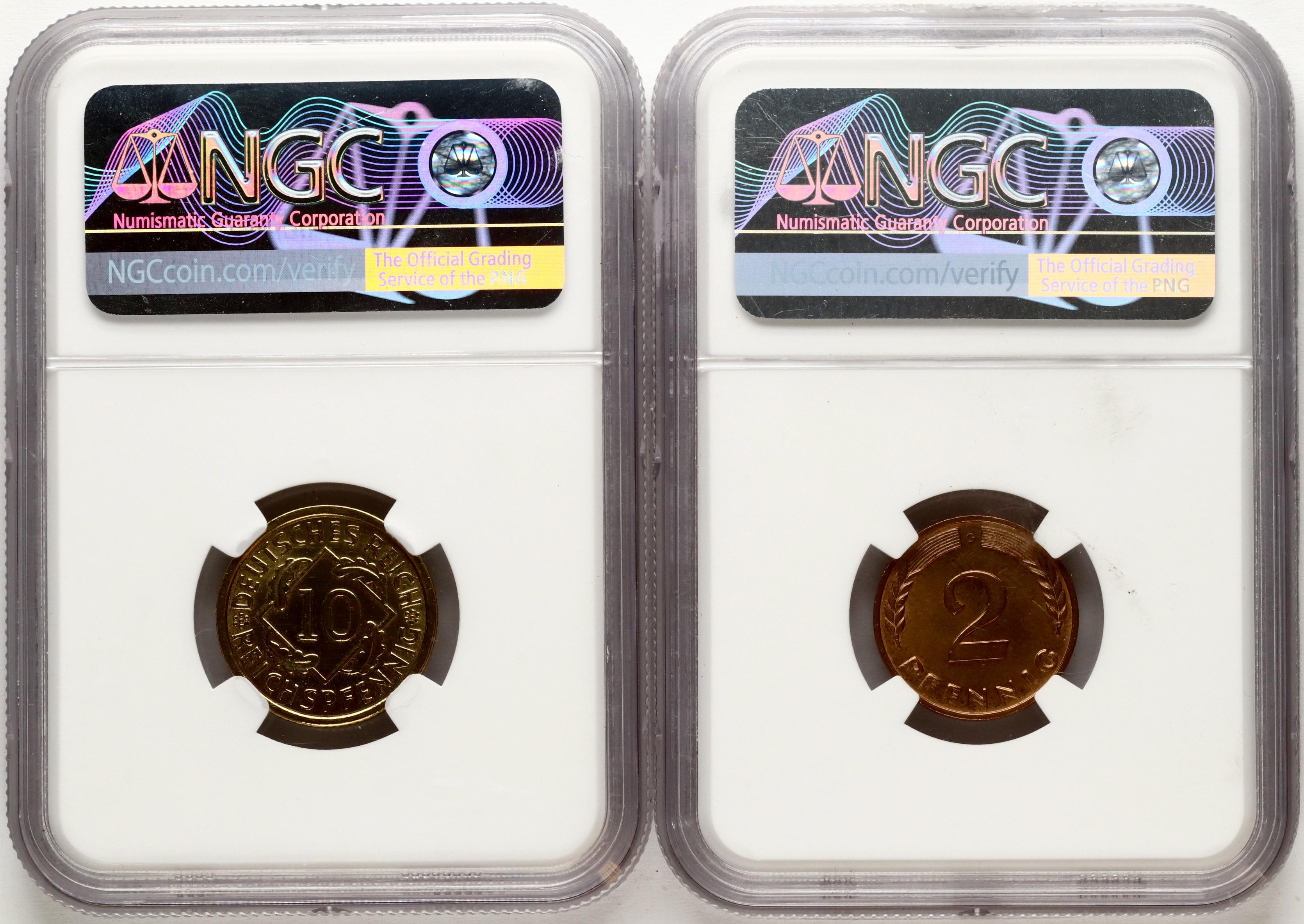 Germany 10 Reichspfennig 1932 A & 2 Pfennig 1967 G NGC UNC DETAILS Lot of 2 coins