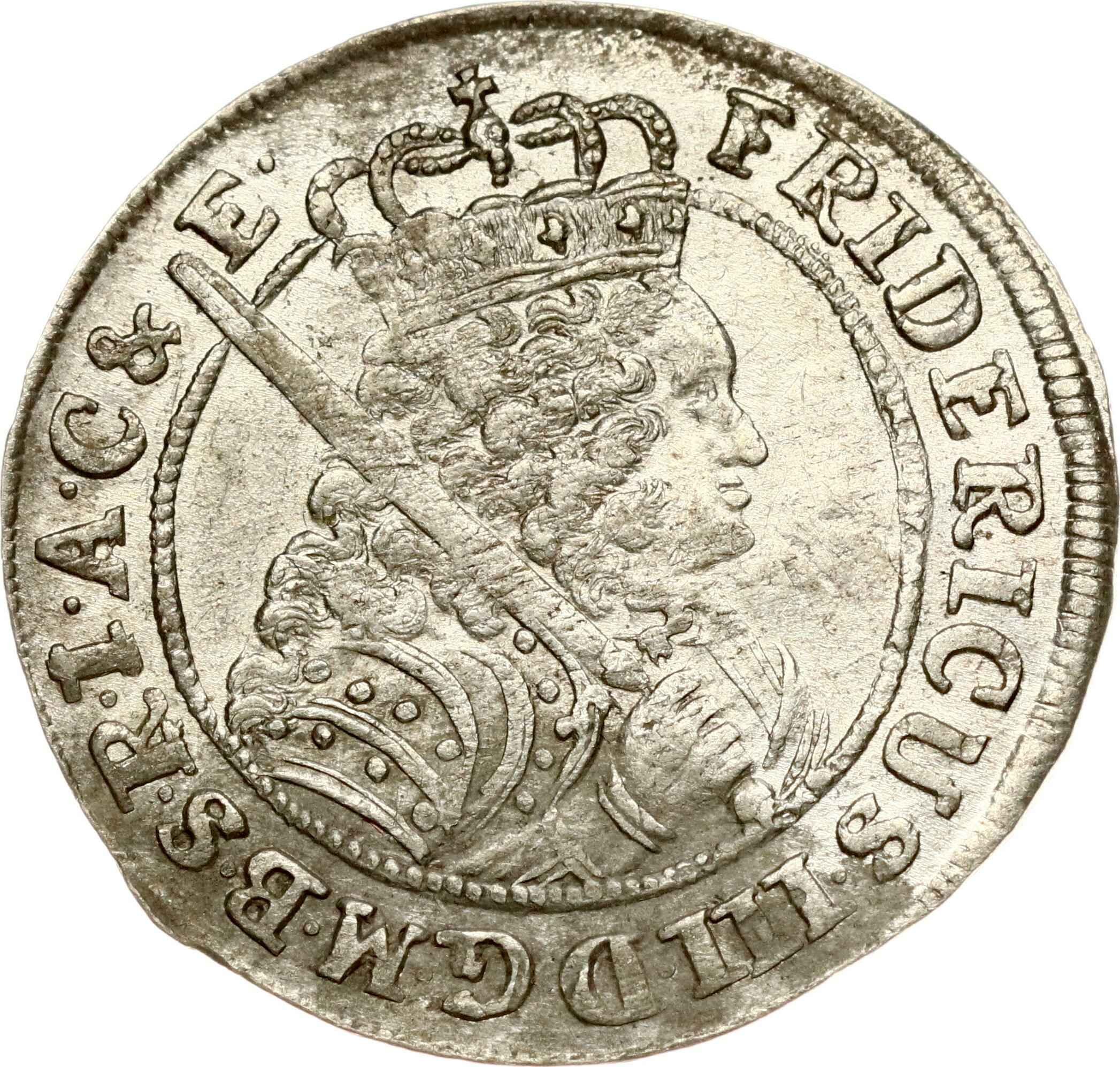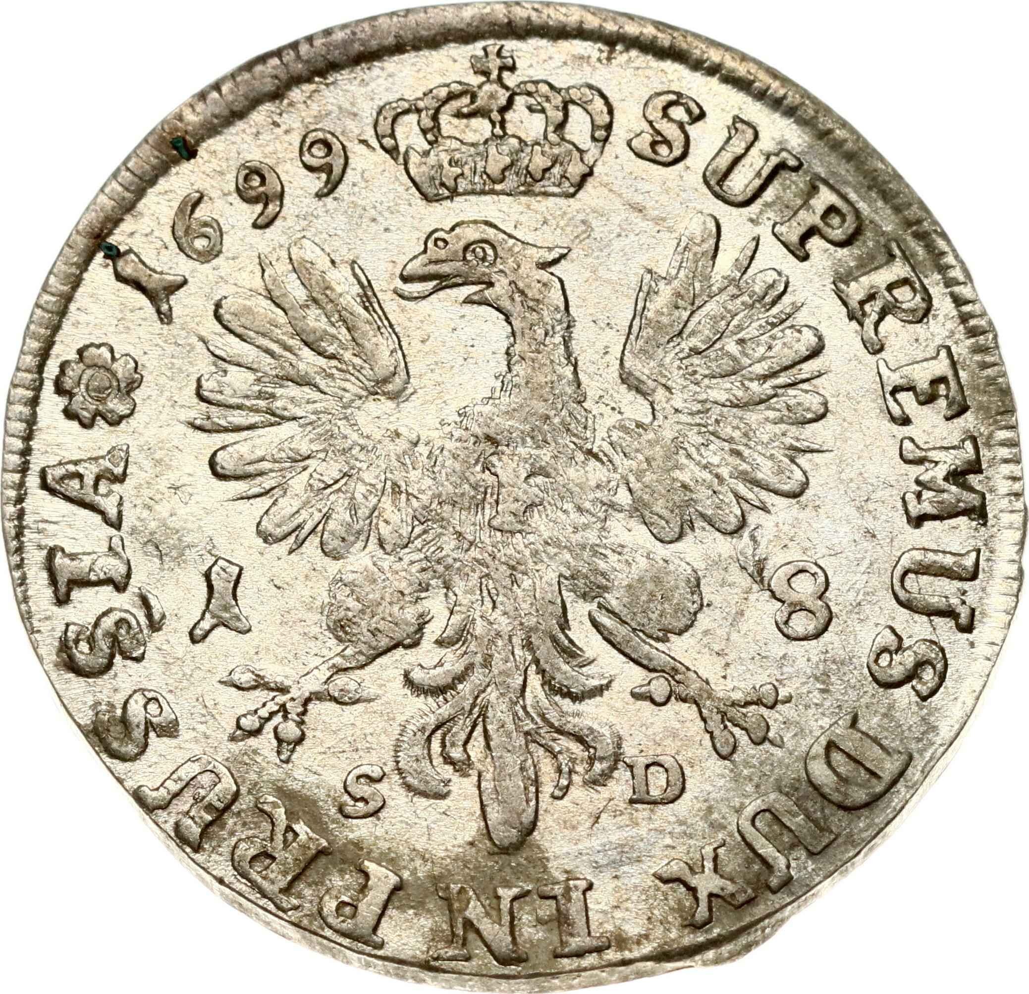 Germany Brandenburg-Prussia. 18 Groscher 1699 SD. Friedrich III (1688-1701). Obverse: Bust of Friedrich III in high armor and with a sword facing right; in inner pearl circle. Lettering: FRIDERICUS.III.D.G.M.B.S.R.I.A.C & E. Reverse: Crowned eagle with open wings and claws; the eagle is between 18 and tail between S D. Around this the legend; a rosette and year. Lettering: SUPREMUS DUX IN PRUSSIA ✿ 1699 18 ꟾ S D. Edge Smooth. Silver. KM 611