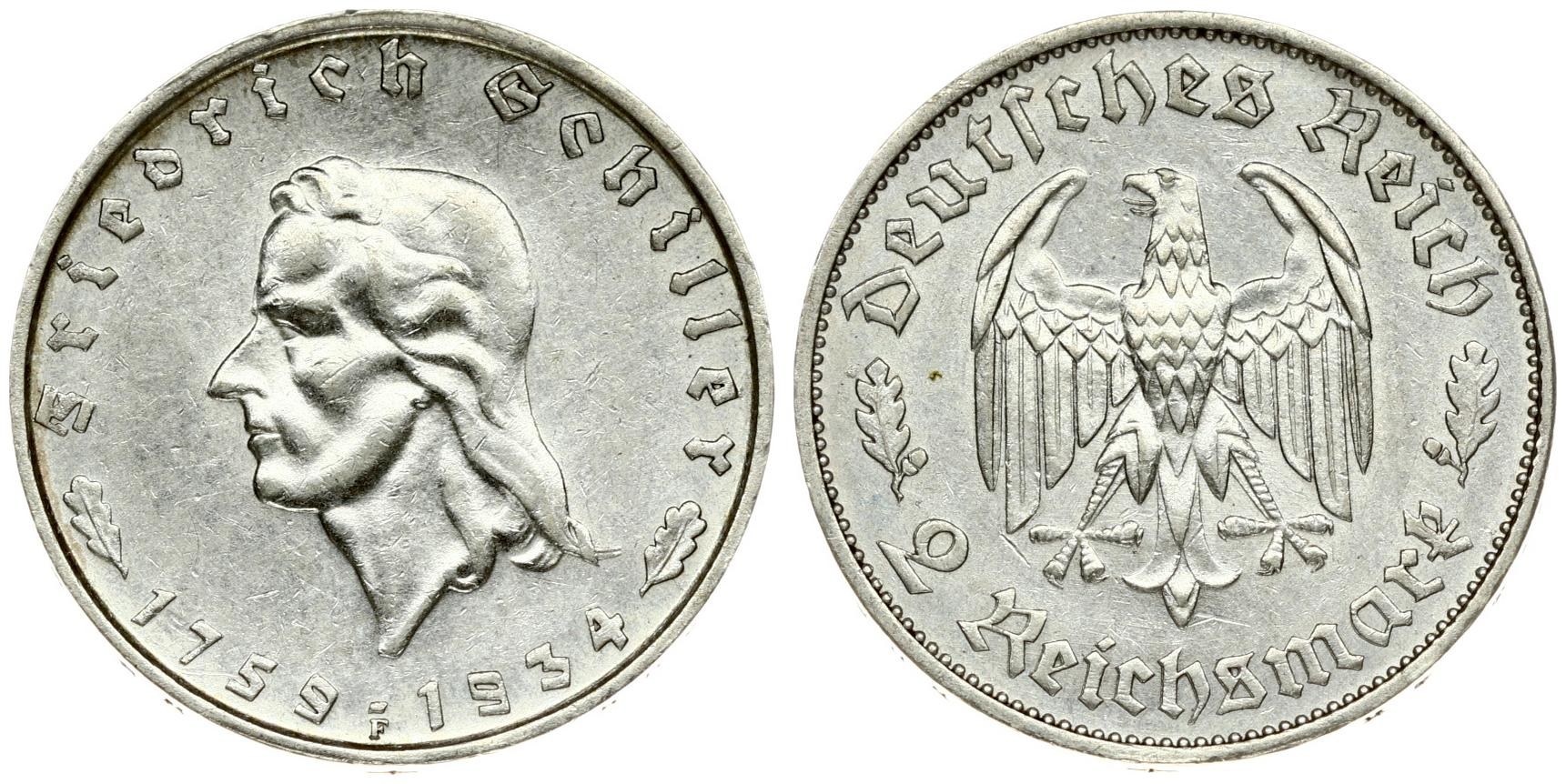 Germany Third Reich 2 Reichsmark 1934F 175th Anniversary - Birth of Schiller. Averse: Eagle; oak leaves flank...