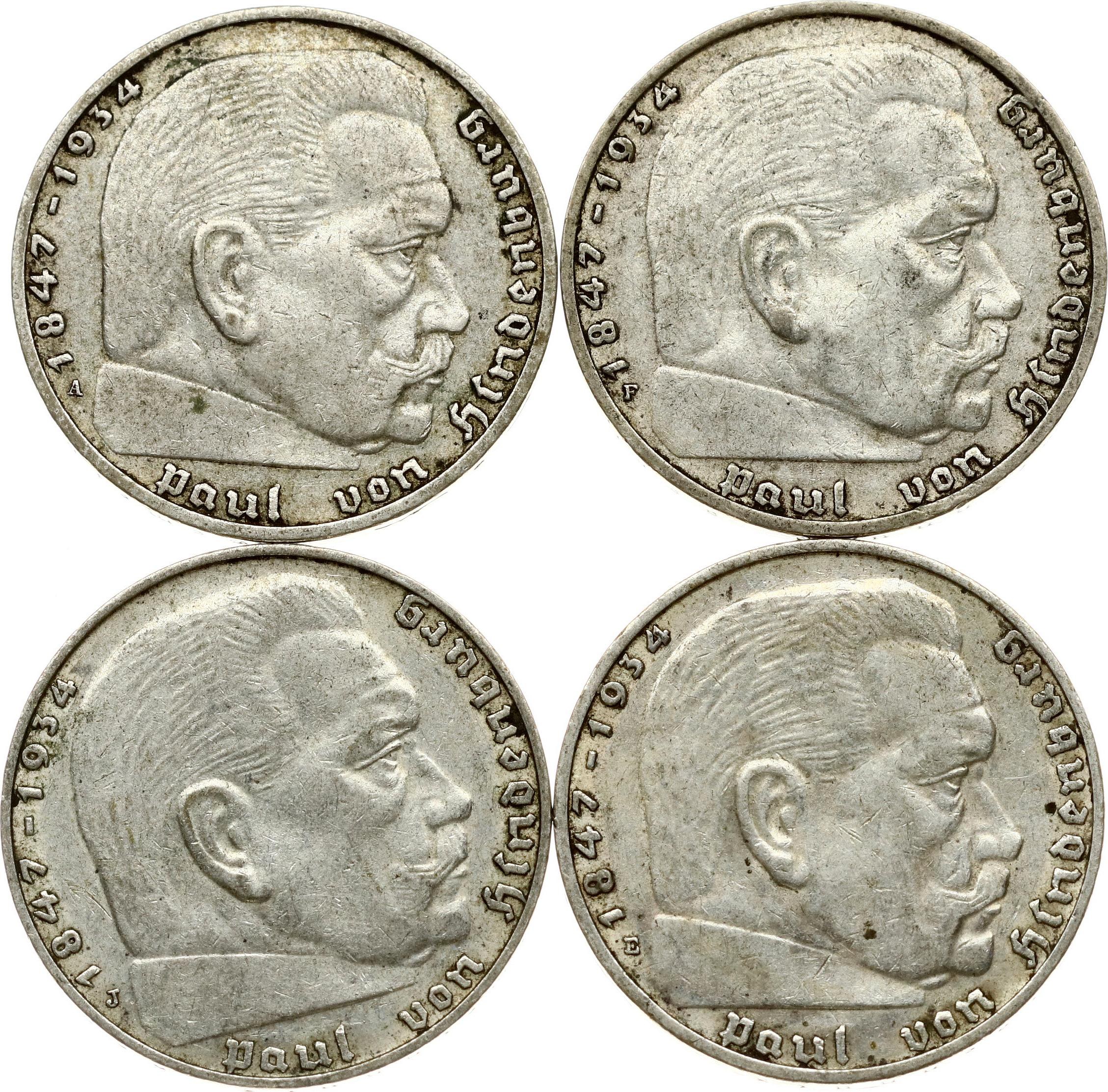 Germany Third Reich 2 Reichsmark 1937 & 1938. 2 Reichsmark Paul von Hindenburg 1937 F, 1937 J, 1938 A, 1938 E. Silver total 31.90 g. KM-93. Lot of 4 Coins