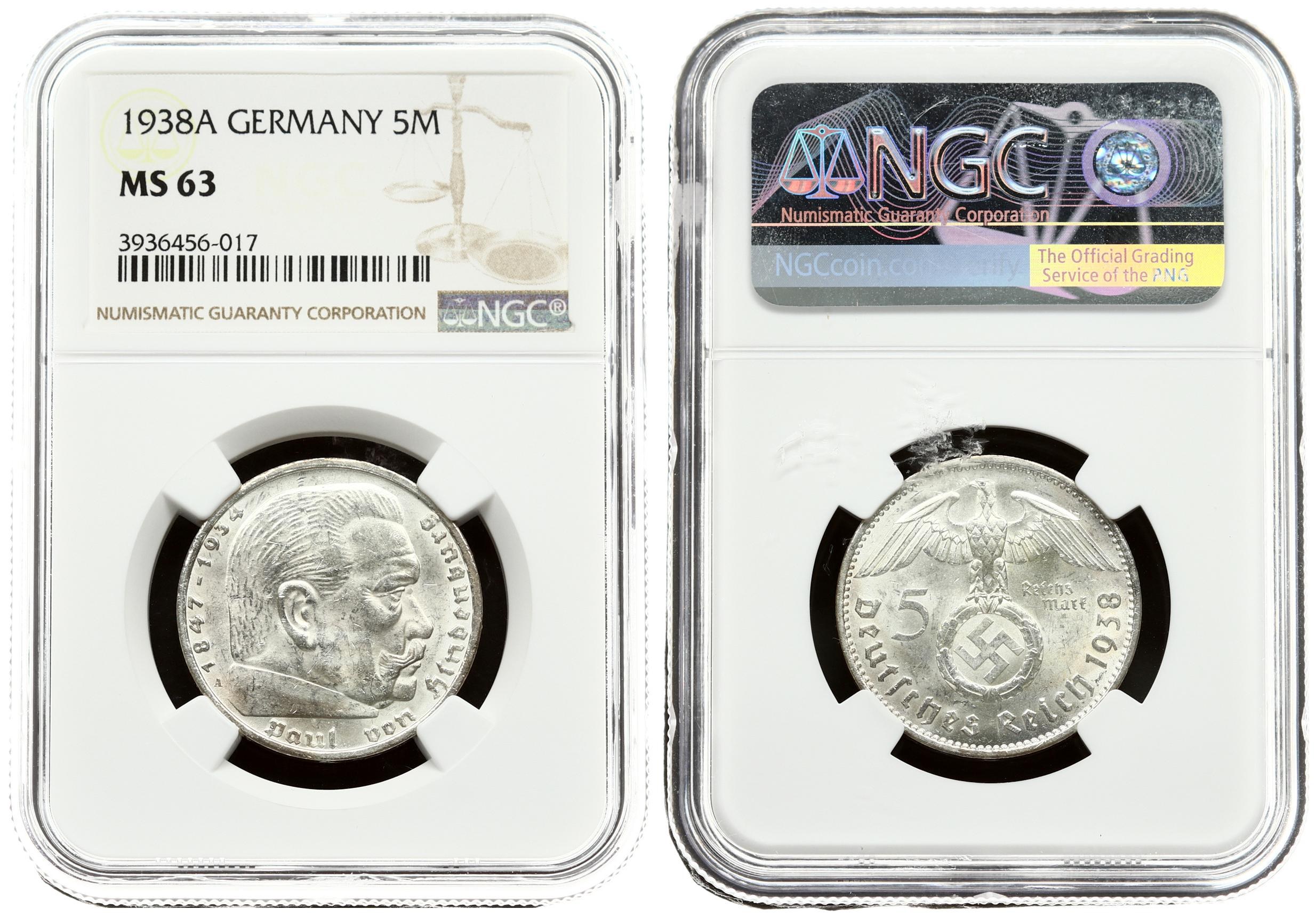 Germany Third Reich 5 Reichsmark 1938 A. Averse: Eagle with Swastika within wreath. Reverse: Large head of Paul von Hindenburg facing right. Edge: Lettering 'GEMEINNUTZ GEHT VOR EIGENNUTZ'. Silver. KM 94. NGC MS 63