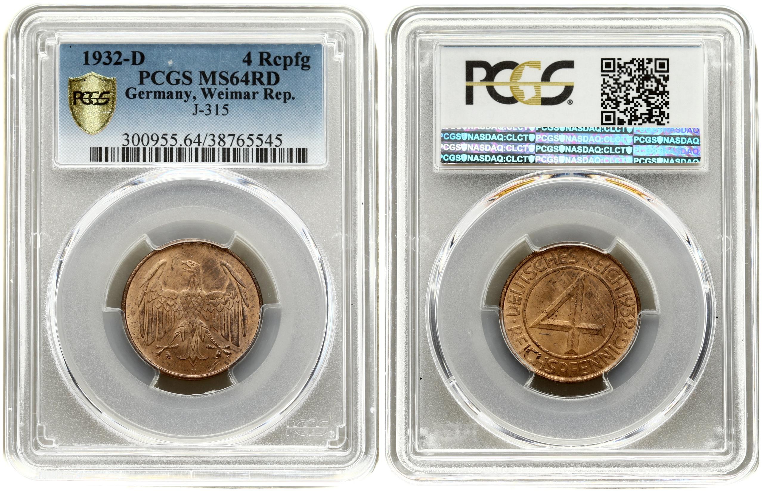 Germany Weimar Republic 4 Reichspfennig 1932 D. Averse: Eagle above the mintmark. Reverse: Large denomination within circl; date at right. Edge: Plain. Bronze. KM 75. PCGS MS 64 RD ONLY ONE COIN IN HIGHER GRADE